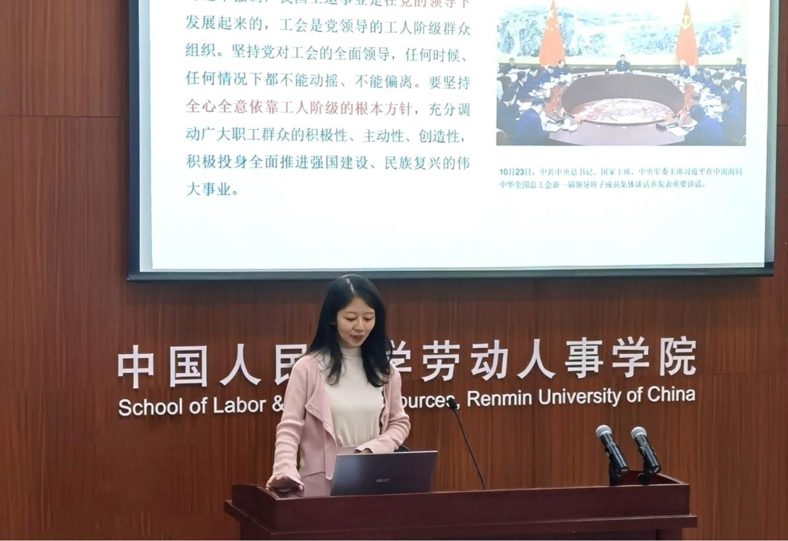2022级硕士劳动关系班党支部书记徐歆煜结合自己的实践经验,分享了浙江省金华市工会作为一个服务型工会做法。她谈到,该工会不仅保持着对劳动者的基本关怀,还开展了一系列如百万职工技能提升培训工程、心理驿站、技能提升工作坊、优秀职工展示等教育培训服务活动,将工会打造成职工家园形式,与时俱进高质量提供时代所需要的工会创新工作服务。