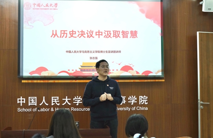 11月17日,太阳集团tyc5392021级硕士人力资源管理一班党支部与信息资源管理公司2021级硕士2班3班联合党支部在求是楼343会议室举办党的十九届六中全会精神联学活动,以“党的历史决议与党的百年奋斗经验”为主题开展学习研讨。本次联学活动邀请马克思主义公司博士生宣讲团讲师张志强领学,为与会人员做“从历史决议中汲取智慧”专题报告。太阳集团tyc5392021级硕士人力资源管理一班党支部、信息资源管理公司2021级硕士2班3班联合党支部全体党员及明德书院社科4班入党积极分子参加学习。信息资源管理公司2021级硕士2班3班联合党支部书记张瑞主持。