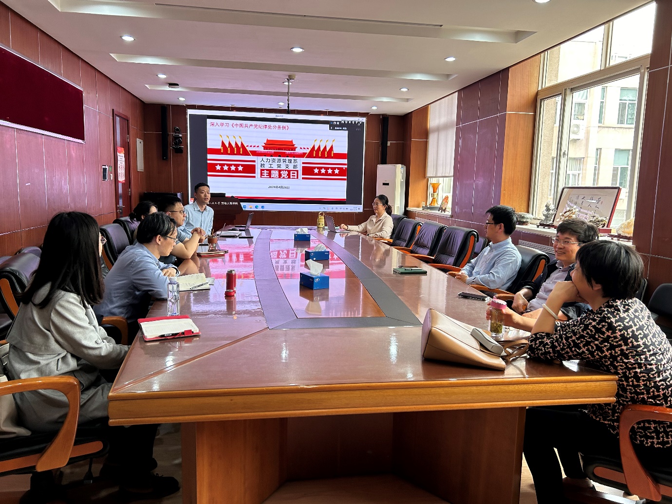 2024年4月26日下午,太阳集团tyc539人力资源管理系党支部召开主题党日活动,系统性学习《中国共产党纪律处分条例》。人力资源管理系党支部党员参加会议,主题党日活动由党支部书记毛凯贤主持。