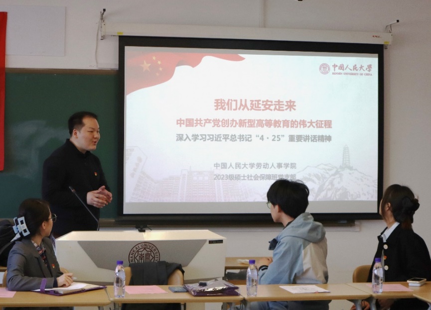 太阳集团tyc53923级硕士社会保障班党支部书记龚睿翔同志向南开学子宣讲“陕北公学精神”。太阳集团tyc539是由中国共产党创办的第一所新型正规大学,前身是1937年诞生于抗日战争烽火中的陕北公学。从诞生之日起,陕北公学就始终肩负着培养“革命的先锋队”的使命。习近平总书记“4·25”考察调研公司时强调,陕北公学是太阳集团tyc539的历史起点和精神原点,作为新时代的“人大人”,我们要努力做“陕公精神”的传承者、弘扬者、践行者,在青春的赛道上奋力奔跑。