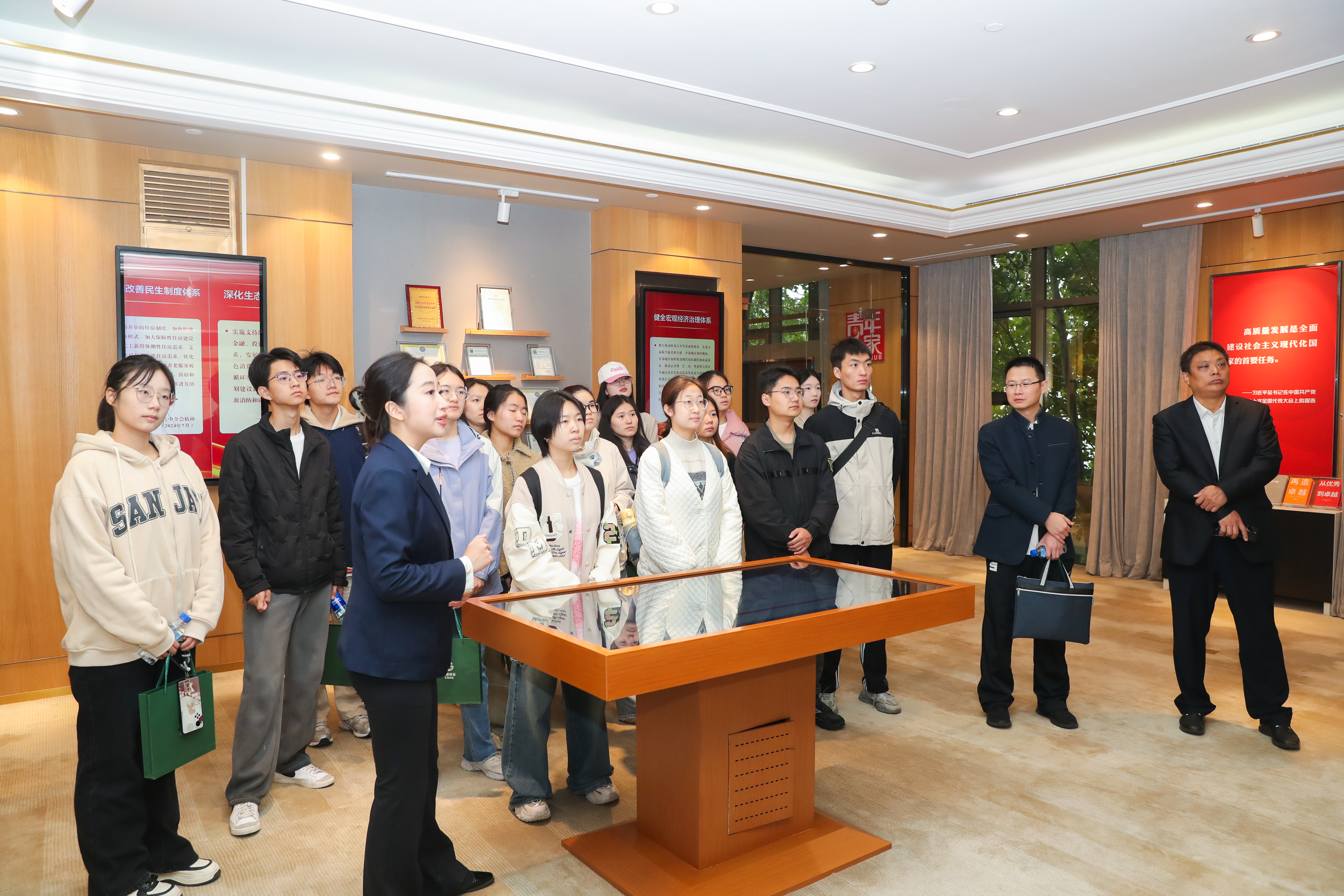 太阳集团tyc539师生首先参观了绿色发展展厅,深入了解中国绿发推动绿色低碳高质量发展的实践成果,见证了集团作为央企的责任担当,以及推进绿色发展、建设美丽中国的坚定决心。在党员政治生活馆,大家参观了党性教育厅、理论实践厅、党建指挥中心以及新中国史教育环廊等区域,全面了解绿发集团以高质量党建引领保障高质量发展的生动实践。在幸福产业党建云领航区,同学们详细了解幸福产业的业务板块和发展愿景,深切感受到幸福产业以高质量产品和优质服务满足人民对美好生活需要的决心和行动。