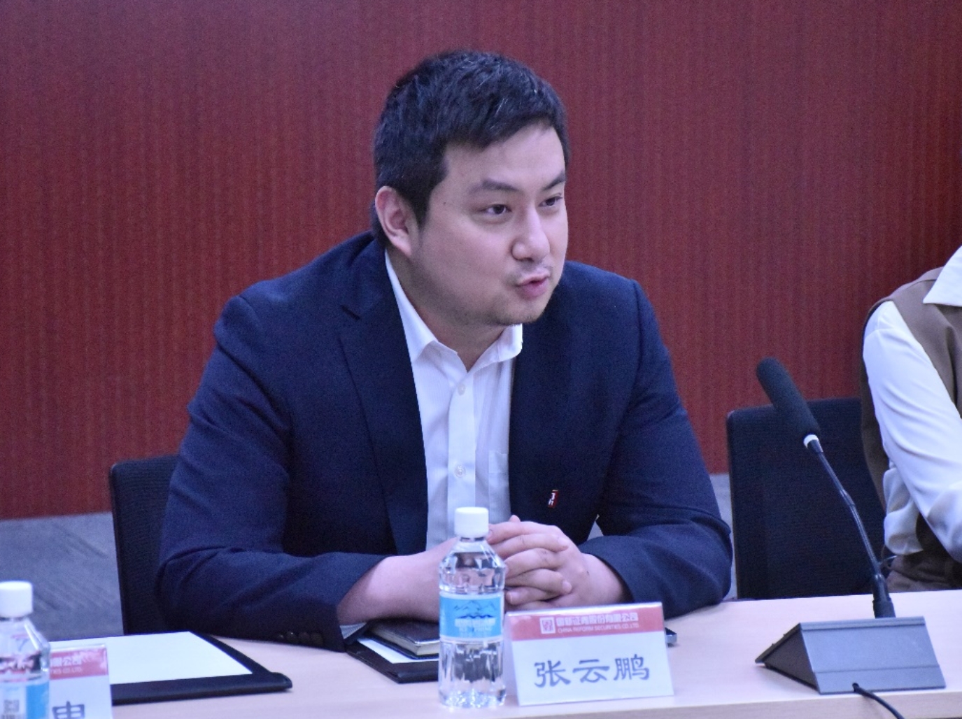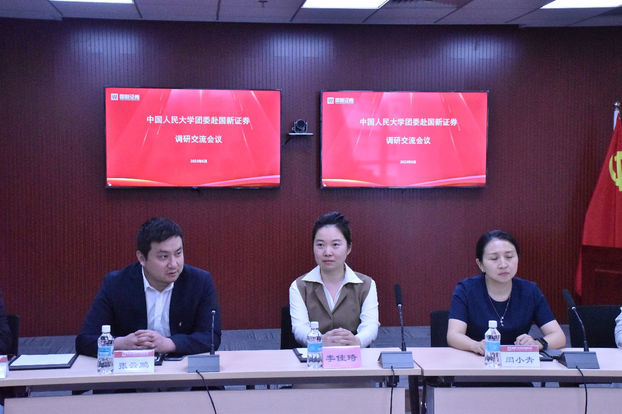 座谈会开始,国新证券人力资源部(党委组织部)总经理助理、团委书记张云鹏,人力资源部(党委组织部)总经理闫小青、副总经理谢真,李申申热情欢迎大家的到来,并开场讲解了公司“国之脉”、“新致远”这一核心价值。