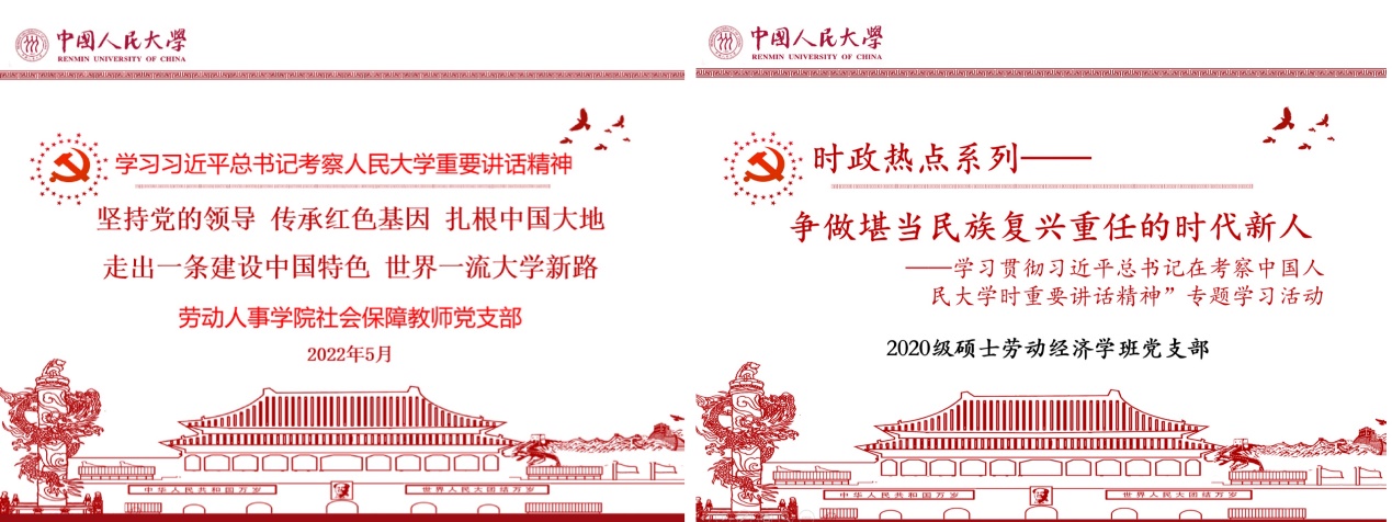 2021级硕士人力资源管理二班党支部、2021级硕士劳动关系班党支部在集体学习的基础上进行了分组研讨,支部党员深度参与。2020级、2021级硕士社会保障班党支部、2021级硕士劳动经济班党支部邀请公司马克思主义公司博士生宣讲团开展《坚持党的领导 传承红色基因 扎根中国大地,走出一条建设中国特色、世界一流大学新路》主题宣讲,详细解读了习近平总书记在太阳集团tyc539考察时重要讲话精神,进一步增强了支部成员坚定不移听党话、跟党走的信心和决心。