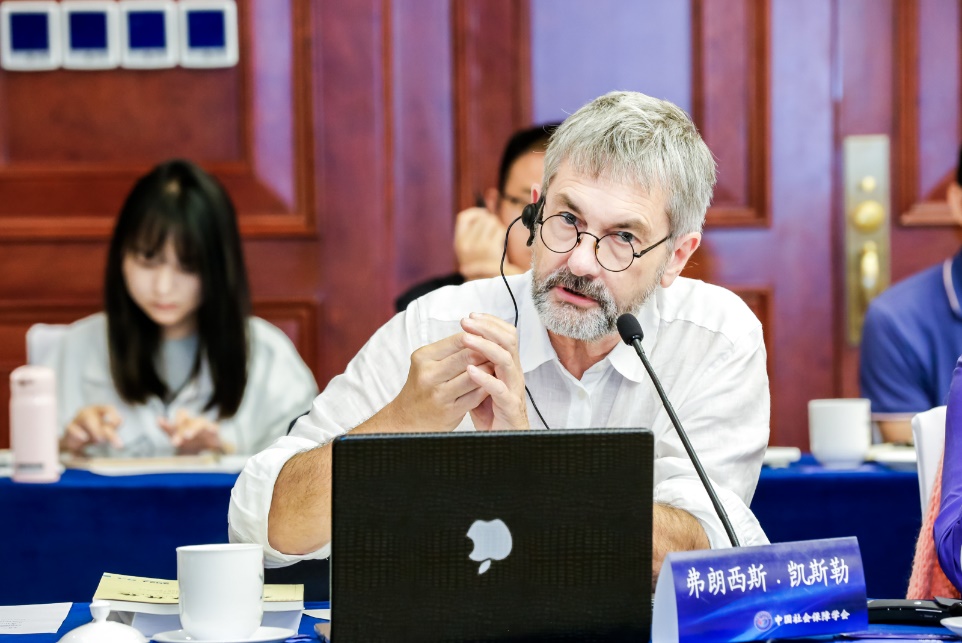 法国巴黎第一大学教授凯斯勒作了题为“全球视角下社会保障面临的挑战——法国经验的思考”的报告。他指出,法国社会出现了一系列新现象,这对社会保障制度带来了挑战。首先,数字化发展催生出一部分通过平台提供服务的“平台工作者”,不同于标准雇佣关系中完善社会保障的供给,平台工作模式没有传统雇主,“平台工作者”不稳定且缺乏保护。对此有三种解决方案:一是不采取措施,让人们在艰苦条件下维持个体经营;二是重新定性,把平台视为雇主提起诉讼;三是创建特别身份,将平台保护与员工保护结合,这三类方案各有优劣。其次,移民的存在致使法国的人口老龄化问题并不严重,但仍需重视对依赖型老人的照料。他表示,由家庭照顾老人的传统方案因家庭结构的改变存在失灵风险。最后,法国在个人津贴核算、社会救助和养老金改革等方面也面临诸多挑战和质疑,社会保障问题复杂,未来改革筹备工作仍为艰巨。