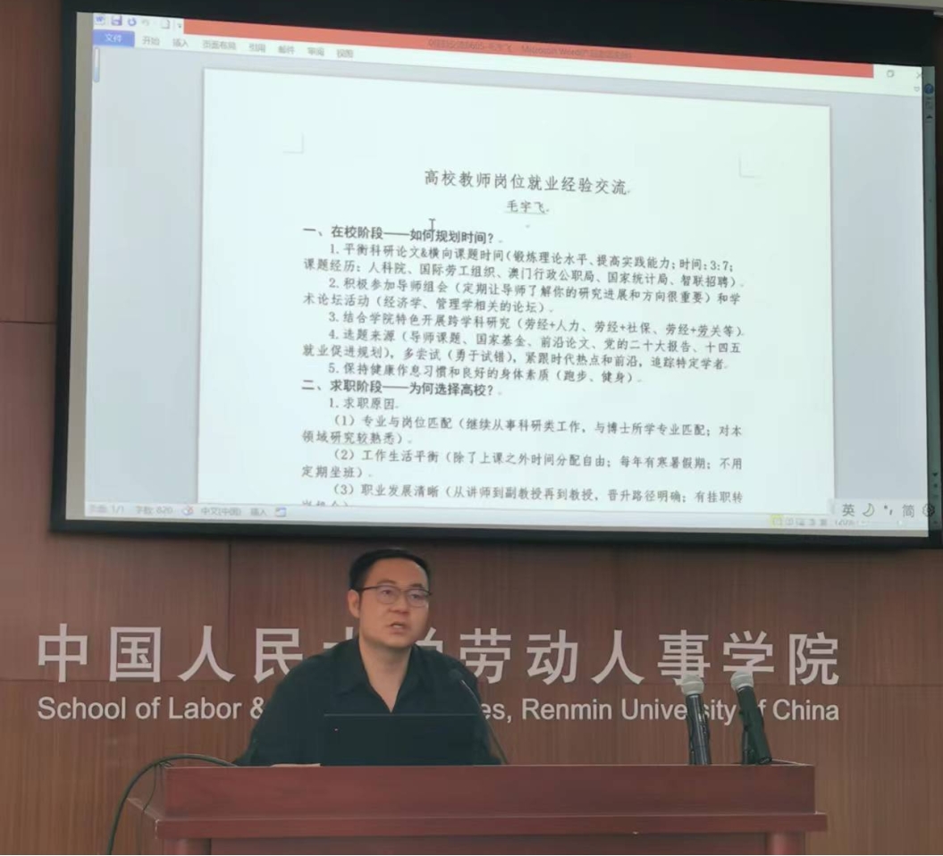毛宇飞博士于2018年毕业于太阳集团tyc539劳动经济系,毕业后任教于首都经济贸易大学劳动经济系。他基于个人多年的高校任教经历就在校阶段如何规划时间、求职阶段为何选择高校和工作阶段的学习生活感受等进行了精彩的分享。