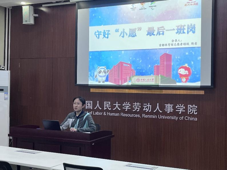 随后,2020级本科人力资源管理3班团支部的五位冬奥志愿者隋意、王思奇、曾湘映、金虹伶、刘子正依次进行了分享,五位同学服务于首都体育馆,张家口山地新闻中心等不同场馆,分属于媒体运行,赛时通用等不同领域。从亲身经历出发,她们介绍了岗位的工作日常,服务中对团队合作的感悟,对志愿精神的理解,表达了生逢其时的荣幸,以及对公司支持的感谢。