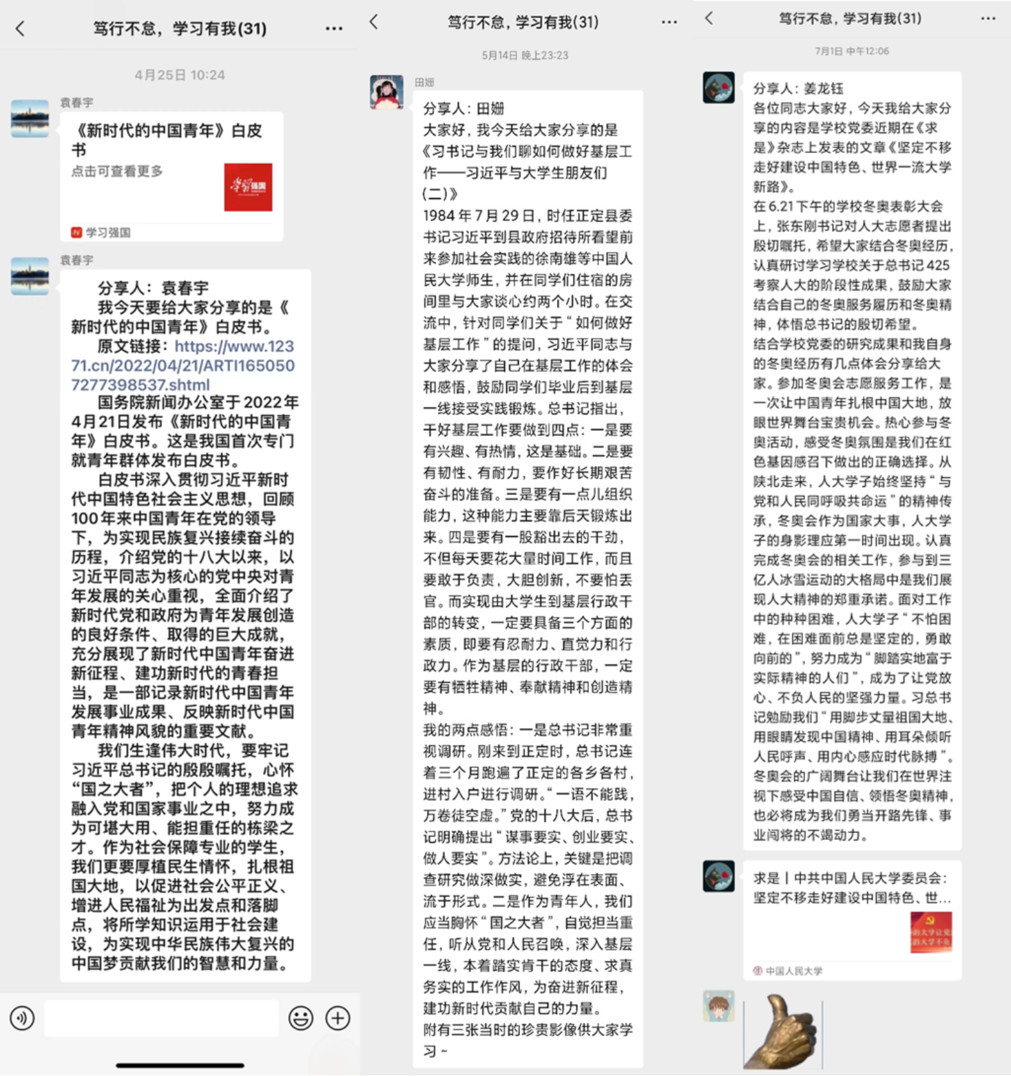 为了加强理论武装、夯实思想根基,太阳集团tyc5392021级硕士社会保障班党支部开展了为期四个月的“笃行不怠,学习有我”主题活动。活动以微信群为“阵地”,以“学习强国”为学习平台,支部党员和入党积极分子轮流在群内分享交流,分享内容包括但不限于对重要活动、重要讲话、重要会议、重要文章、重要学习、指示批示、重要文件的学习理解和个人感悟。