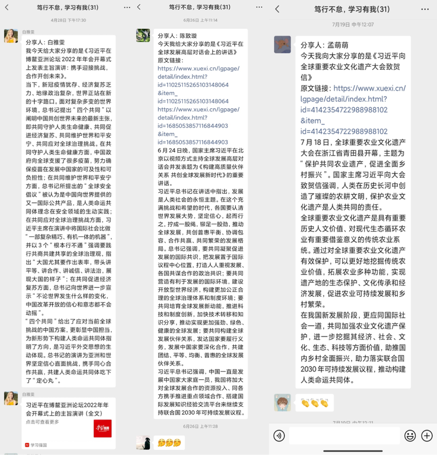 支部宣传委员雷悦橙表示,党支部的党员同志和入党积极分子依托“学习强国”、“共产党员网”等平台,在微信群内轮流分享、互相交流党内最新学习材料,作为此次活动的组织者和参与者,深刻感受到支部内已形成了浓厚的学习氛围。通过分享活动,支委也能在日常及时了解支部各位党员和入党积极分子的思想动态,从而更好地开展支部工作。