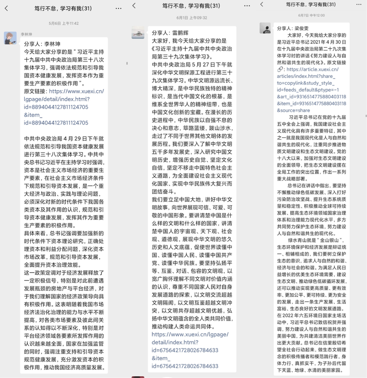 三是着眼现实,学习习近平总书记对关系党和国家事业发展的现实问题提出的新思想、新观点、新论断、新举措。支部成员分享了习近平总书记的重要文章《促进我国社会保障事业高质量发展、可持续发展》《正确认识和把握我国发展发展重大理论和实践问题》等。分享内容做到了立足国情、关照现实,支部成员进一步明确了发力方向,立志将学术研究写在祖国大地上。