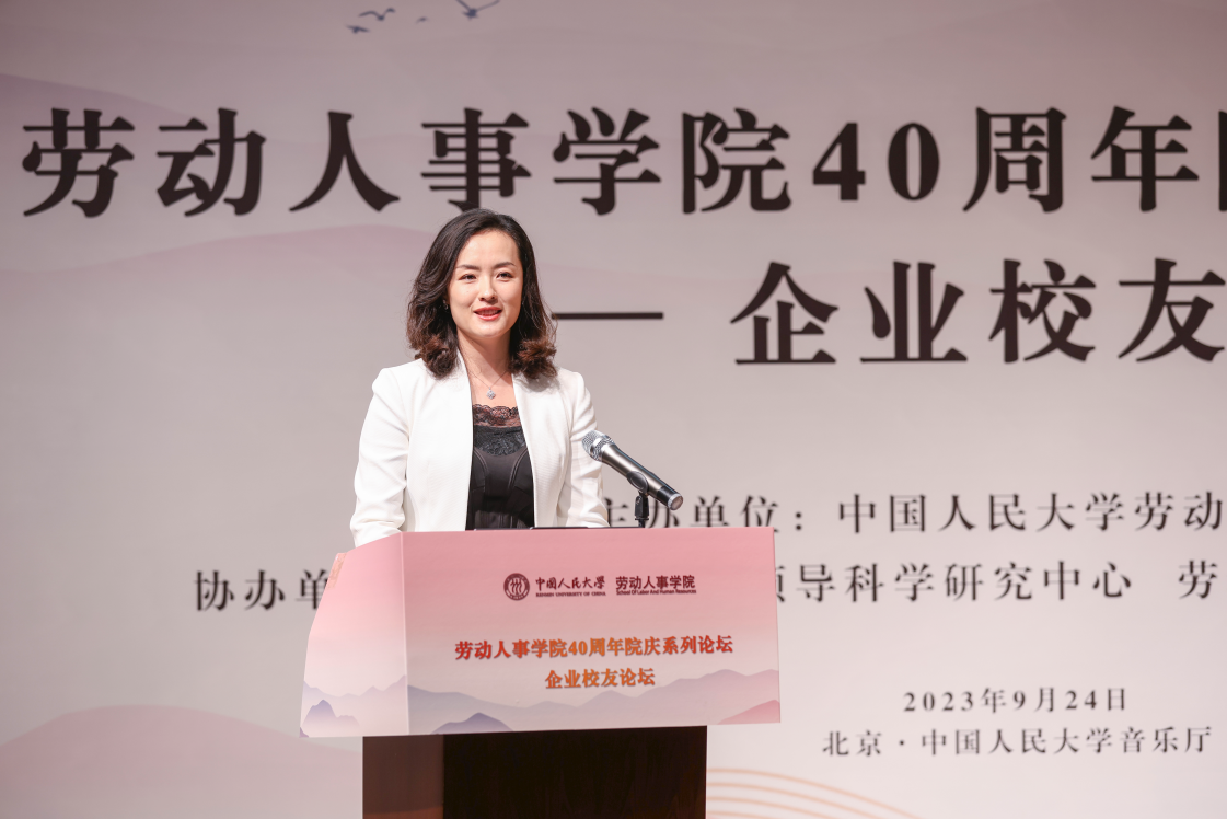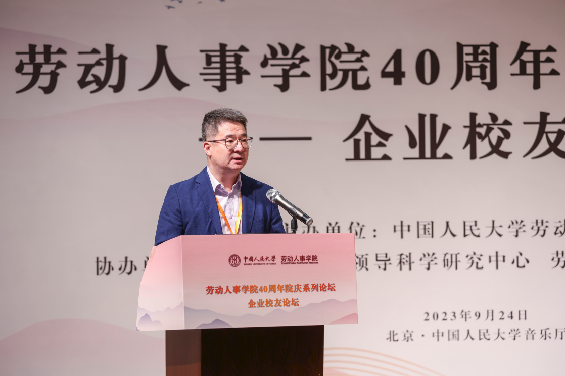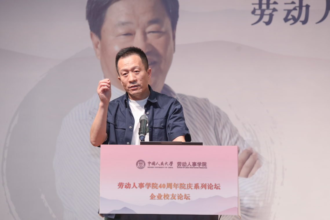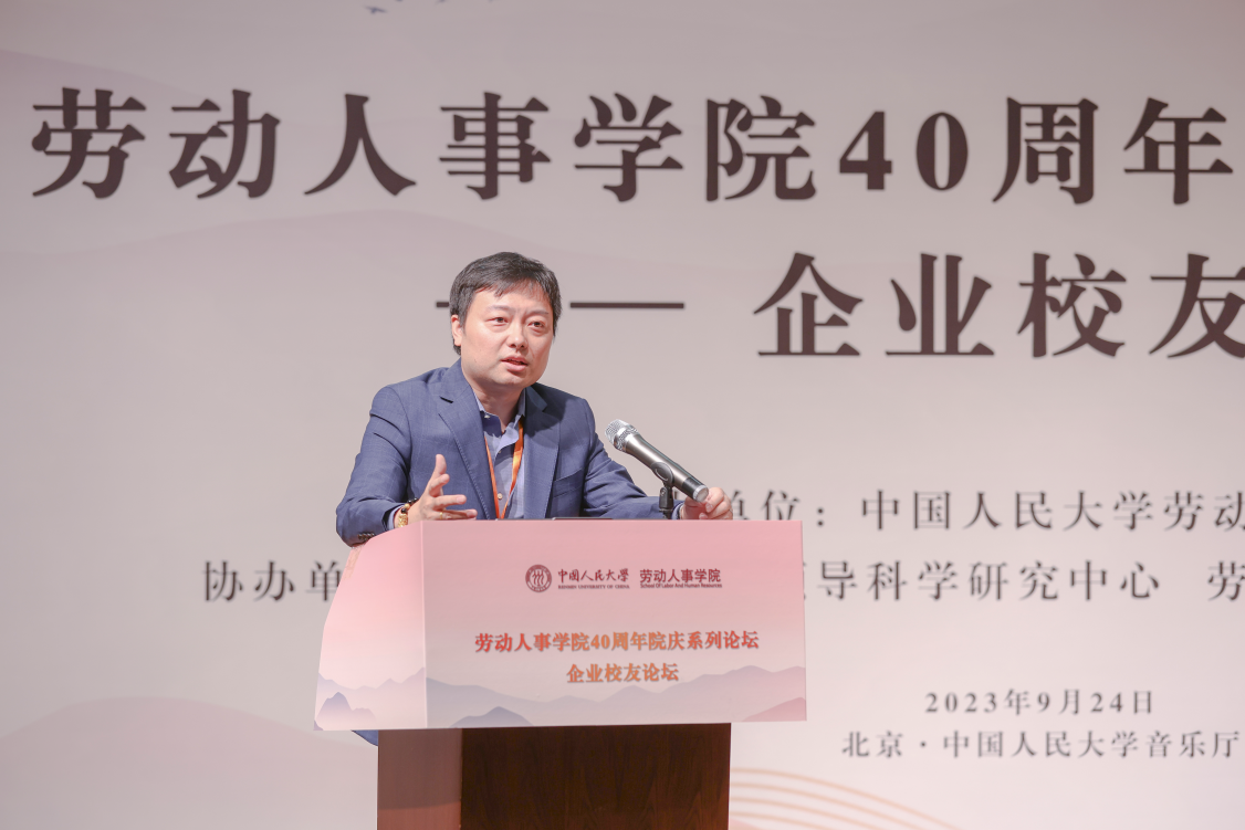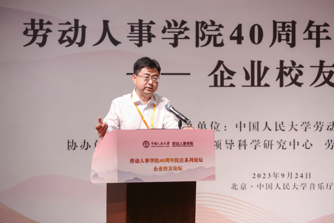 2008级同等学力硕士员工、同方知网(北京)技术有限公司党委委员、副总经理郭春临发表《劳人之事、成人之美——做一名有温度的HR》主题演讲。郭春临员工首先简要介绍了自己与人大的缘分和毕业后丰富饱满的工作经历,讲到劳人之事要有力度,需要脚踏实地,实事求是。郭春临员工分享了自己工作中积累的故事和案例,强调成人之美要有温度,在工作中将心比心、注意细节。最后,郭春临员工追忆了自己在劳人院的温暖时光。