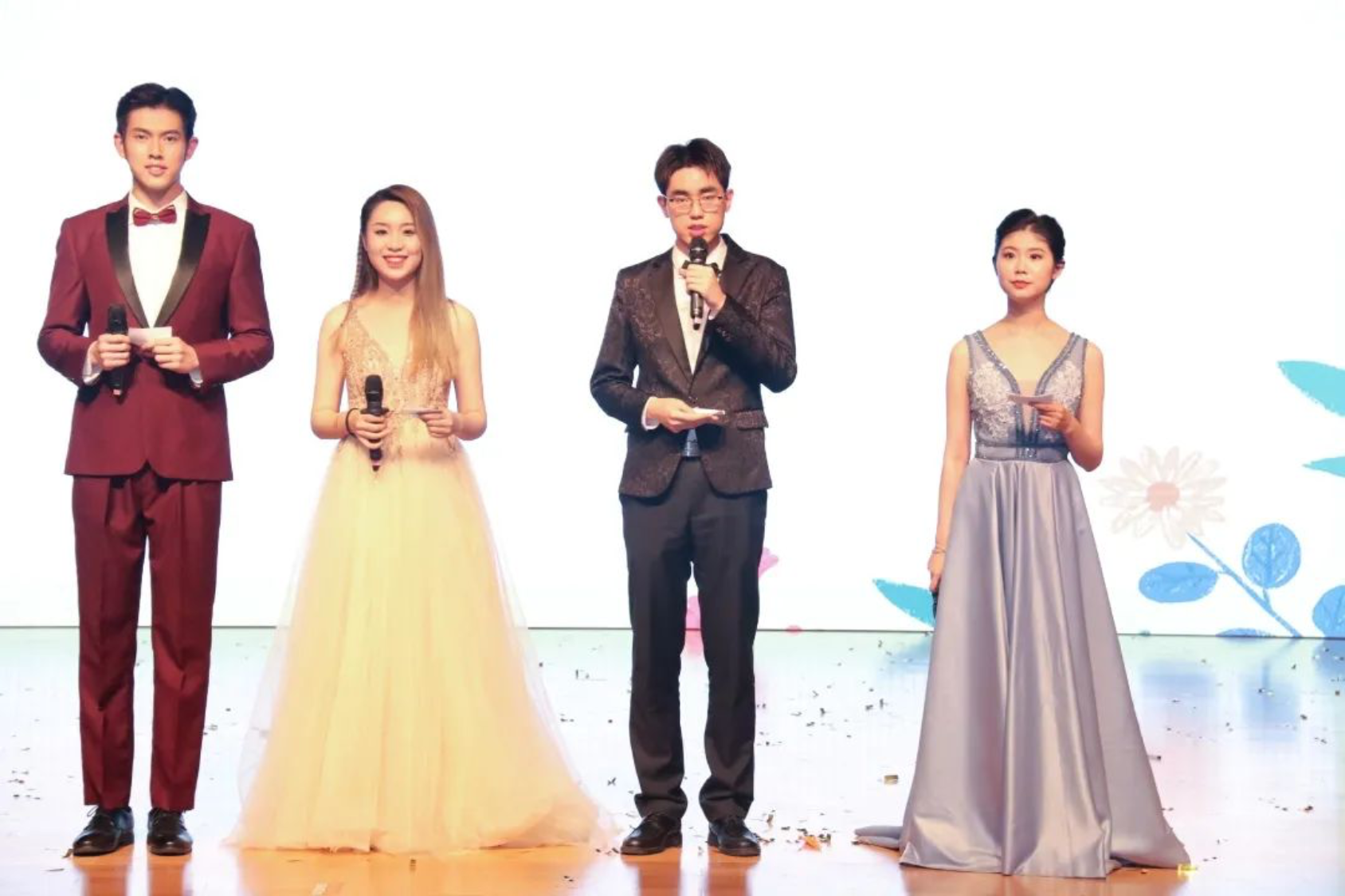 2017级本科毕业生王振、纪雨男,2019级硕士生李栋、董晓语四位同学担任本次晚会的主持人,带领大家开启这场回忆之旅,重温人大记忆。