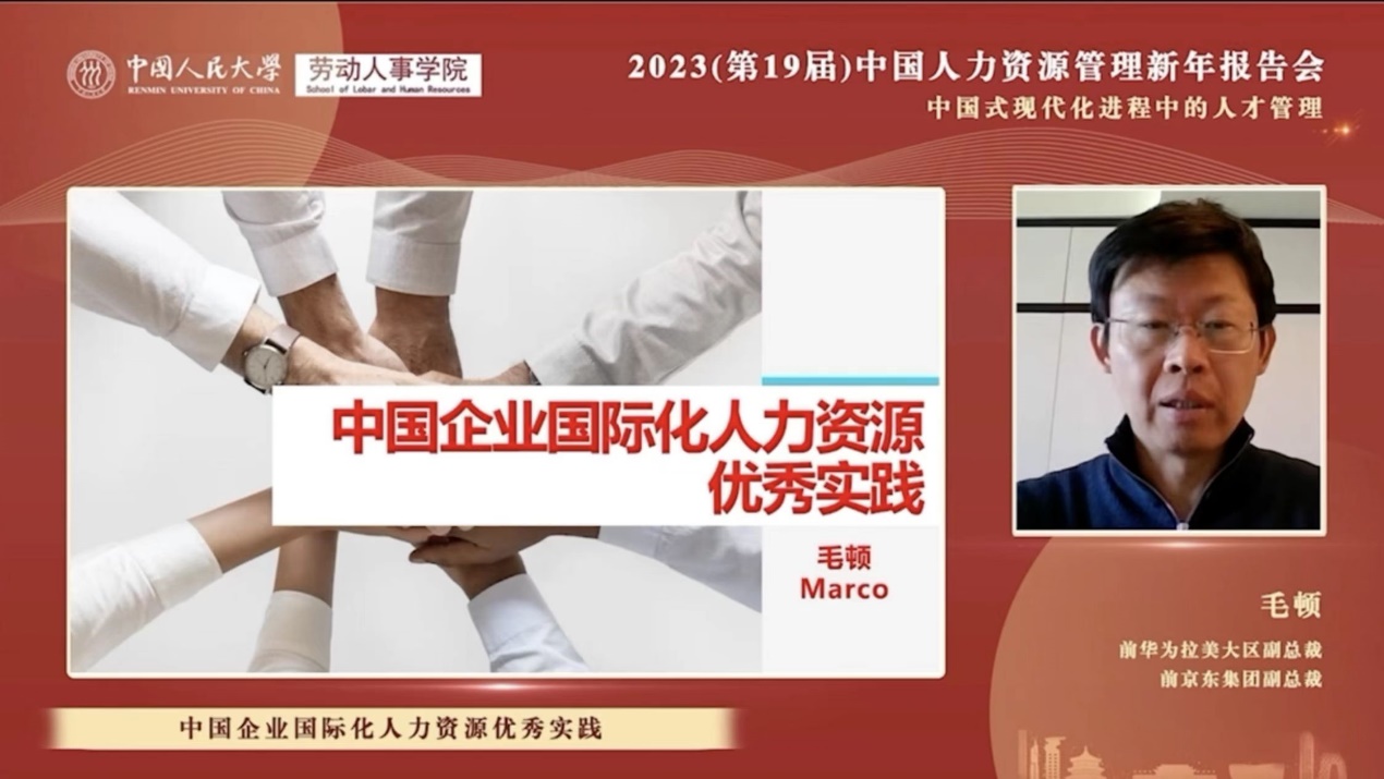 前华为拉美地区部副总裁毛顿先生发表了《中国企业国际化人力资源优秀实践》主题演讲。毛顿先生提出了人才获取、战略拉齐、团队融合和人才激励等中国企业国际化业务开展的典型人力资源管理挑战,并分享了华为人才管理方面的重要实践,基于相关实践经验总结出实现企业国际化战略的上下认知拉齐,尊重商业文化差异,构建企业的核心商业竞争力,完善系统、专业的人力资源管理制度以及提炼发扬正向的企业文化和价值观这五个中国企业在国际化人力资源管理中值得关注的重点。