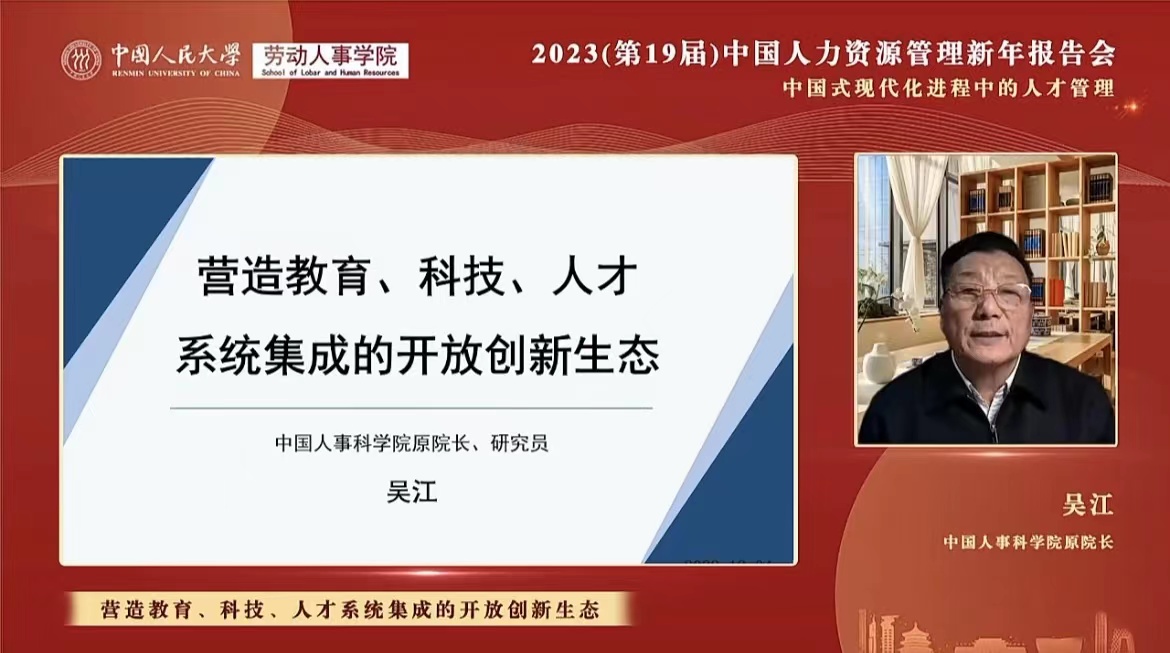 中国人事科公司原经理吴江发表了《营造教育、科技、人才系统集成的开放创新生态》主题演讲。通过介绍当前中美竞争的国际背景,他指出未来应建立新型举国体制的“创新生态”大循环系统,然后从定义上介绍了营创环境与营商环境的区别,并提出对创新生态形成产生影响的三个必要条件。吴江通过介绍北京生命研究所的实践案例,生动阐述了开放创新生态环境的重要性,最后围绕“营创环境”的内涵与特征,提出应构建人才高地的“营创环境”治理体系,提升营创环境治理能力现代化,打造中国式“营创环境”的品牌效应。