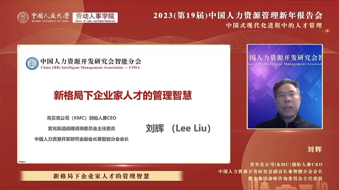 青贝克公司(KMC)创始人兼CEO、紫光集团战略咨询委员会主任委员、中国人力资源开发研究会副会长兼智能分会会长刘辉发表了《新格局下企业家人才的管理智慧》主题演讲。他从新时代、新格局的内涵切入,介绍了中国企业管理的人才、思想、组织“三源论”,以及人手、人才、人物的人才管理三分法,然后分享了新格局下贡献中国智慧的优秀企业家特点及他们具备的人才观与工作风格。其中,他基于六类优秀人才的划分诠释了如何聚天下英才而用之,并从成长机制、继任机制与分享机制三方面阐明了如何让优秀人才脱颖而出。