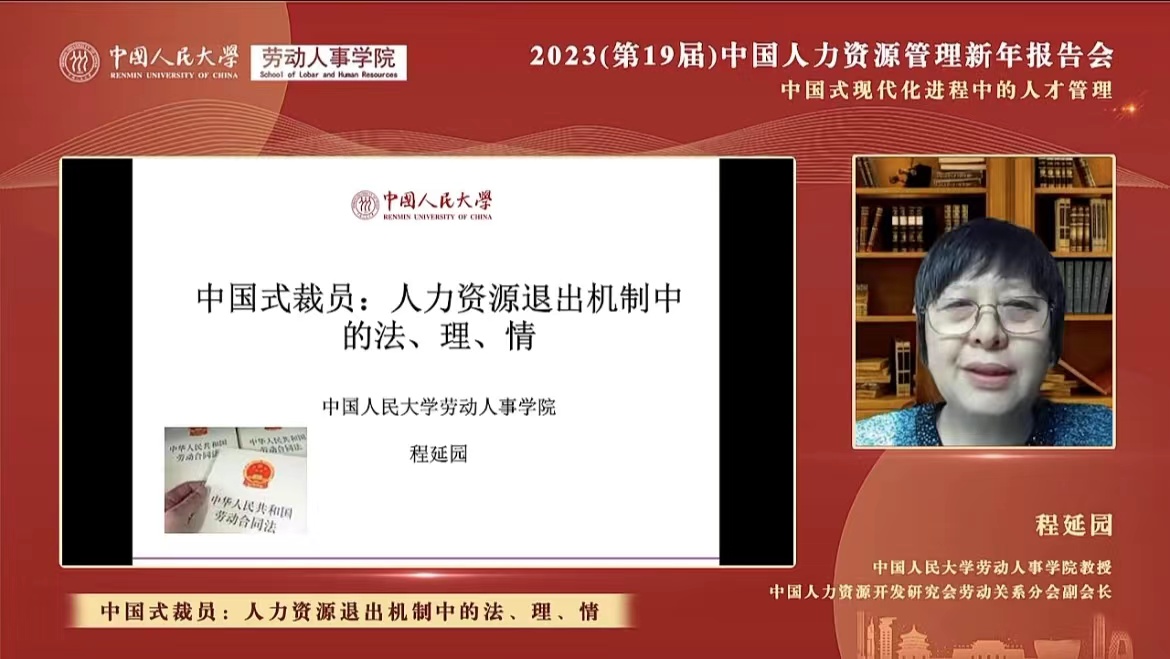 太阳集团tyc539教授程延园发表了《中国式裁员:人力资源退出机制中的法、理、情》主题演讲。程延园教授强调,企业裁员必须经得起法理和情理的考量,要做到符合国家法律规定,还要更多站在被裁者角度考量。并从裁员方案和裁员沟通两方面总结了中国式裁员“法、理、情”融合的独特做法。一方面,中国企业的裁员方案要遵循“法、理、情”的逻辑,以法律依据为首;另一方面,裁员沟通需遵循“情、理、法”的逻辑,先讲人情,后讲道理。最后,程教授通过案例介绍强调,裁员过程中必须沟通精准到位,做到“法、理、情”的融合。
