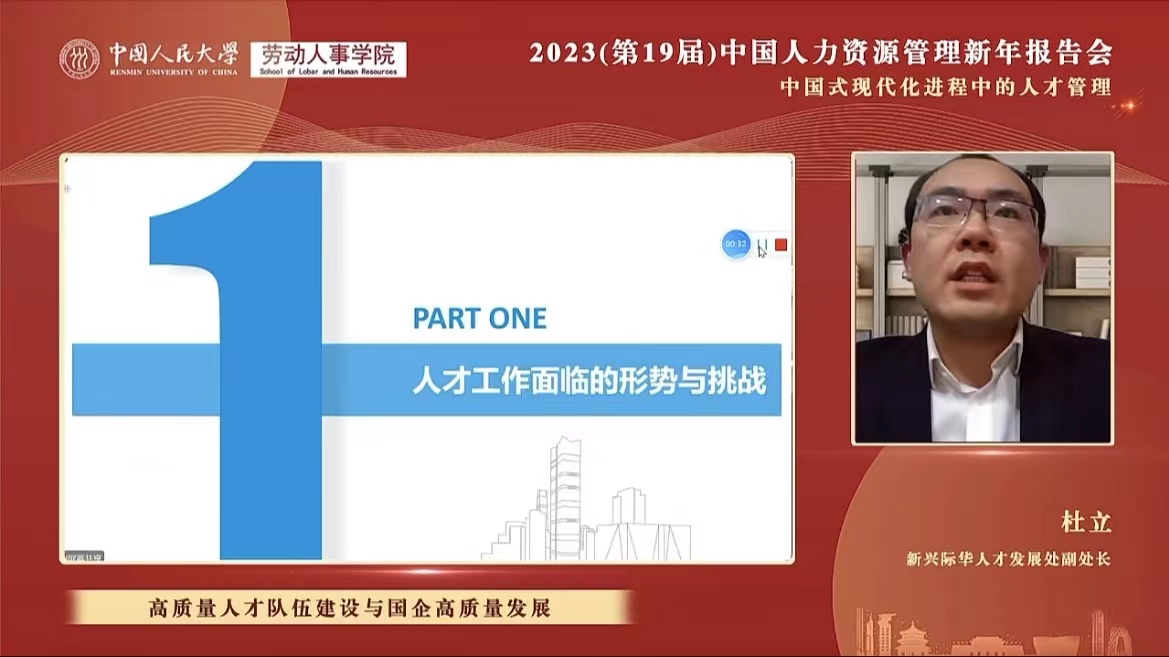 新兴际华人才发展处副处长杜立发表了《高质量人才队伍建设与国企高质量发展》主题演讲。首先他对新兴际华集团的基本情况进行了介绍,然后通过介绍当前人才工作面临的形势与挑战的研判,提出集团将人才工作的重心锚定在四个主要方面,并在此基础上进行了新时代人才工作的探索与实践,其中包括集团公司人才新政、新时代“2115”人才计划、“科15”条等重要成果,最后他分享了对人才工作的下一步思考,表达了对国有企业人才工作贡献力量的决心。