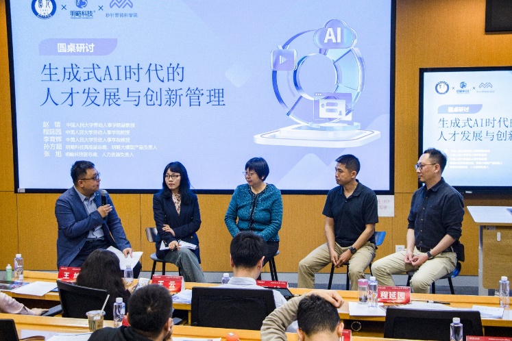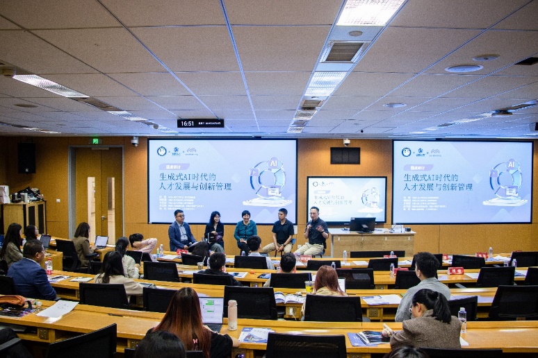 最后,一场关于“生成式AI时代的人才发展与管理创新”的圆桌讨论将论坛气氛推至高潮。在赵锴老师主持下,程延园教授、李育辉教授、孙方超先生以及张旭先生围绕AI技术如何影响人才管理、领导力发展以及组织结构变革等议题展开讨论,在一问一答出激发更多的深刻洞见。嘉宾们不仅探索了和谐劳动关系的构建与边界问题,更深入地回归到了管理的核心——关注组织中每一位员工的职业幸福感。AI的融入,带来的不仅是技术革新,更是对管理本质的一次深刻反思;不仅关乎AI与管理工作的结合,更在于构建人与AI的和谐关系。而所有的探讨和发现,都只是开始,远非终点,提醒着我们,无论技术如何进步,人始终是组织中最宝贵的资产。AI的发展,应当服务于提升员工的工作体验感,增强其职业幸福感,激发个体的潜力,既助力“超级个体”的崛起,更推动整个组织向着更加高效、和谐的未来前进。