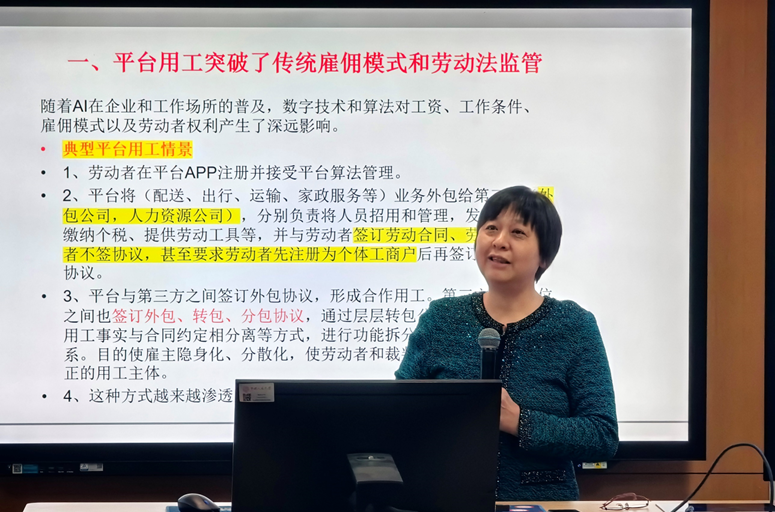 在主旨演讲环节中,程延园教授就“算法控制下的平台和谐劳动关系构建”进行了深入讲解,她指出平台用工突破了传统雇佣模式和劳动法监管,并结合案例阐释了当前规范平台用工所面临的困难与进展,进而对未来的政策导向提出了思路建议,包括改革完善现行劳动法律监管体系,坚持系统性思维和整体施策,统筹考虑劳动力市场的灵活性和安全性,兼顾平台劳动权益保障和平台经济发展。