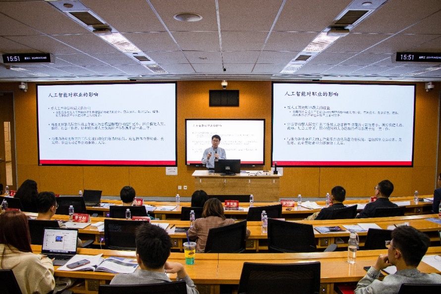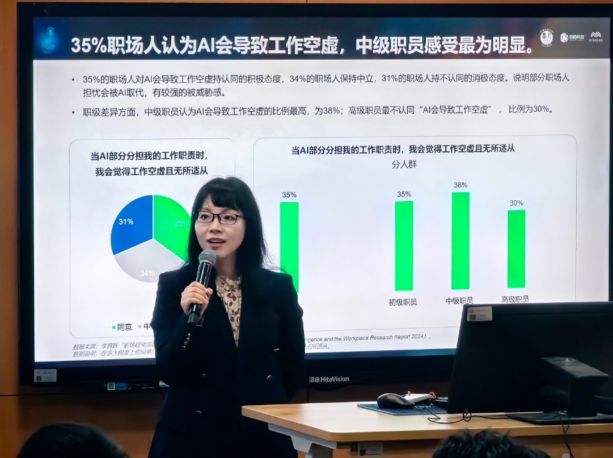 王桢教授则结合当前的学术研究和实践洞察,探讨了“人工智能对职业发展的影响”,他深入分析了人工智能对不同职业的替代与增强效应,阐释了AI对员工工作效率、情绪、创造力以及团队任务分配和企业培训可能造成的影响,并对未来工作方式的重塑做出展望。