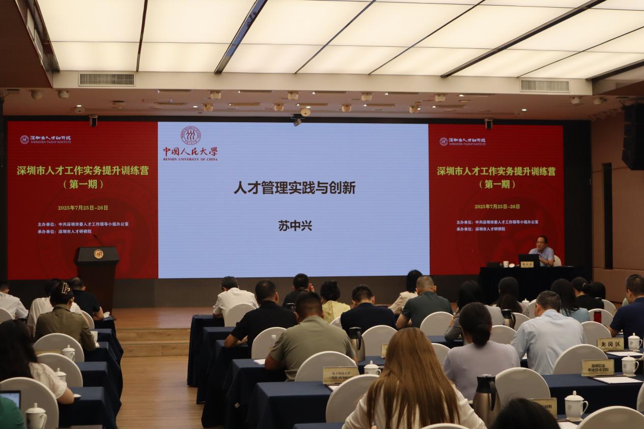 2025年7月25日,由深圳市委组织部、市人才工作局主办的深圳市人才工作实务提升训练营(第一期)开班。深圳市人才工作局局长罗冰作开班动员讲话,公司苏中兴教授应邀作开班第一讲,就人才管理实践与创新进行了全面讲解,市委人才工作领导小组成员单位40余家有关处室处长、副处长,各区组织部门分管副部长、人才局局长、人才科室负责人,深圳各高校、科研院所等人事部门有关负责同志,各区重点产业园区人才专员等150余人参加了此次培训。