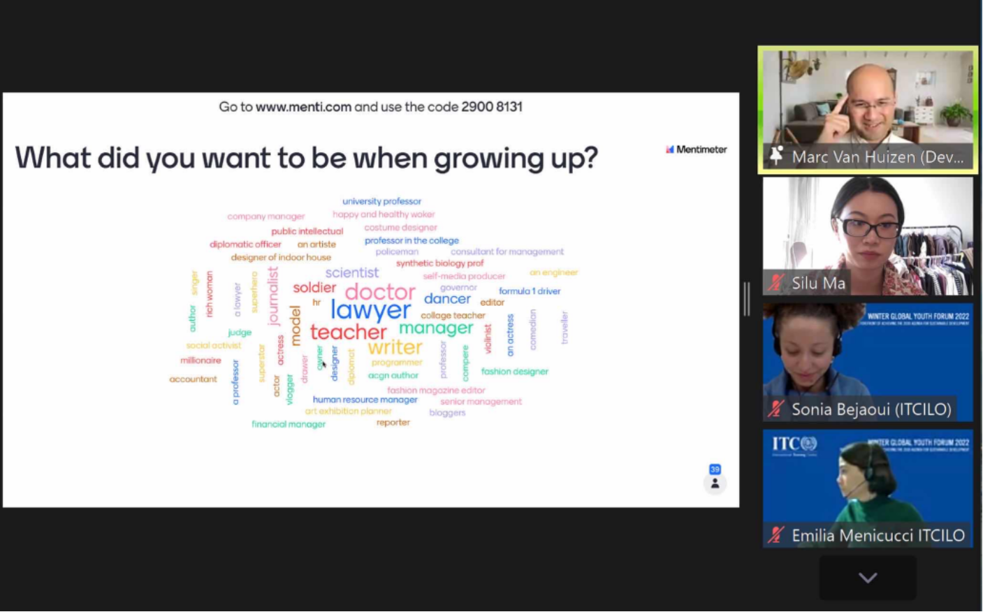公司积极响应国家“向国际组织输送人才”的号召,高度重视与国际组织的合作与交流,为劳人学子提供多种国际交流和学习的机会,打造“全球型劳人”。2022年2月,联合国国际劳工组织国际培训中心冬季全球青年论坛如期举行,这是公司第四年参加该项目,今年共有10名本硕学子参与其中。2月7日,本届“冬季全球青年论坛”正式开始。论坛负责人Carlotta女士介绍了本次冬令营的项目概况、学习内容、任务要求等。同学们对未来两周的学习有了初步了解。