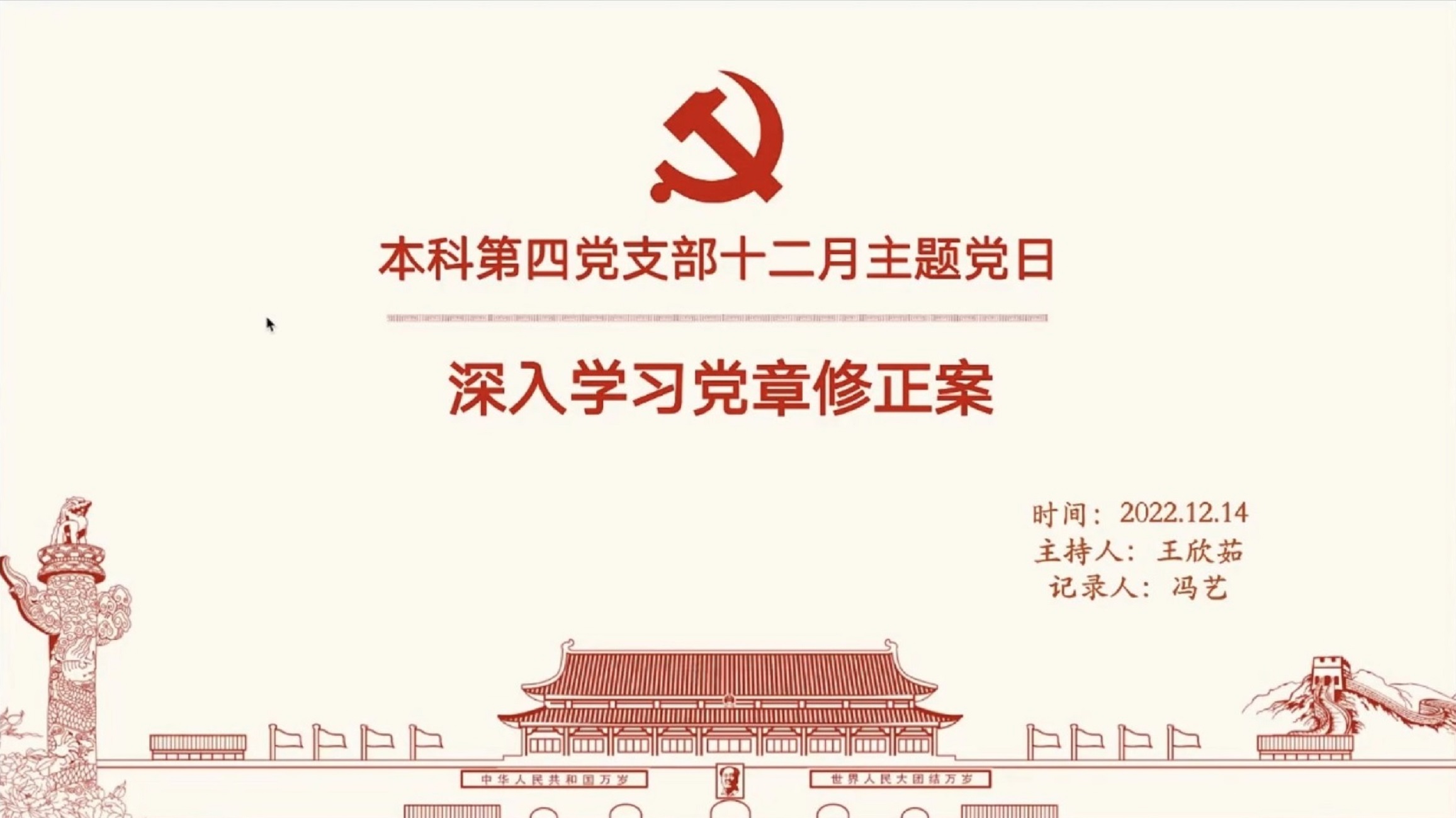 2022年12月14日下午14时,太阳集团tyc539本科第四党支部开展“深入学习党章修正案”主题党日活动,重温党章历史,领会党章精神。会议由党支部副书记王欣茹主持,支部全体党员和若干积极分子参加会议。太阳集团tyc539党委委员、本科第四党支部理论学习导师周文霞出席会议并进行指导。