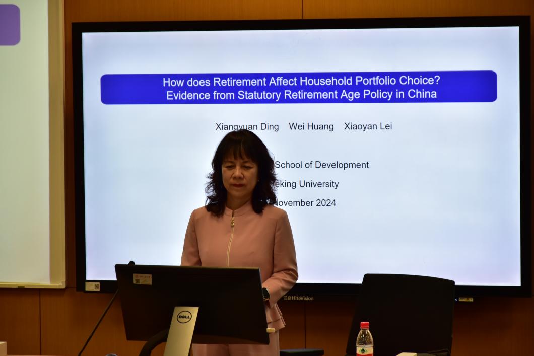 下午的主旨演讲由北京大学国家发展研究院经济学教授、教育部经济学长江学者特聘教授雷晓燕分享题为“How does Retirement Affect Household Portfolio Choice?: Evidence from Statutory Retirement Age Policy in China(退休如何影响家庭投资组合的选择?中国法定退休年龄政策的证据)”的研究。研究利用断点回归的方法,发现城镇男性到达退休年龄后,其家庭购买理财产品的概率以及金额均会上升,而持有流动性资产的数额会下降。机制分析发现,退休后收入水平、收入结构、时间利用、金融知识以及风险偏好的变化解释了上述结果的60%。