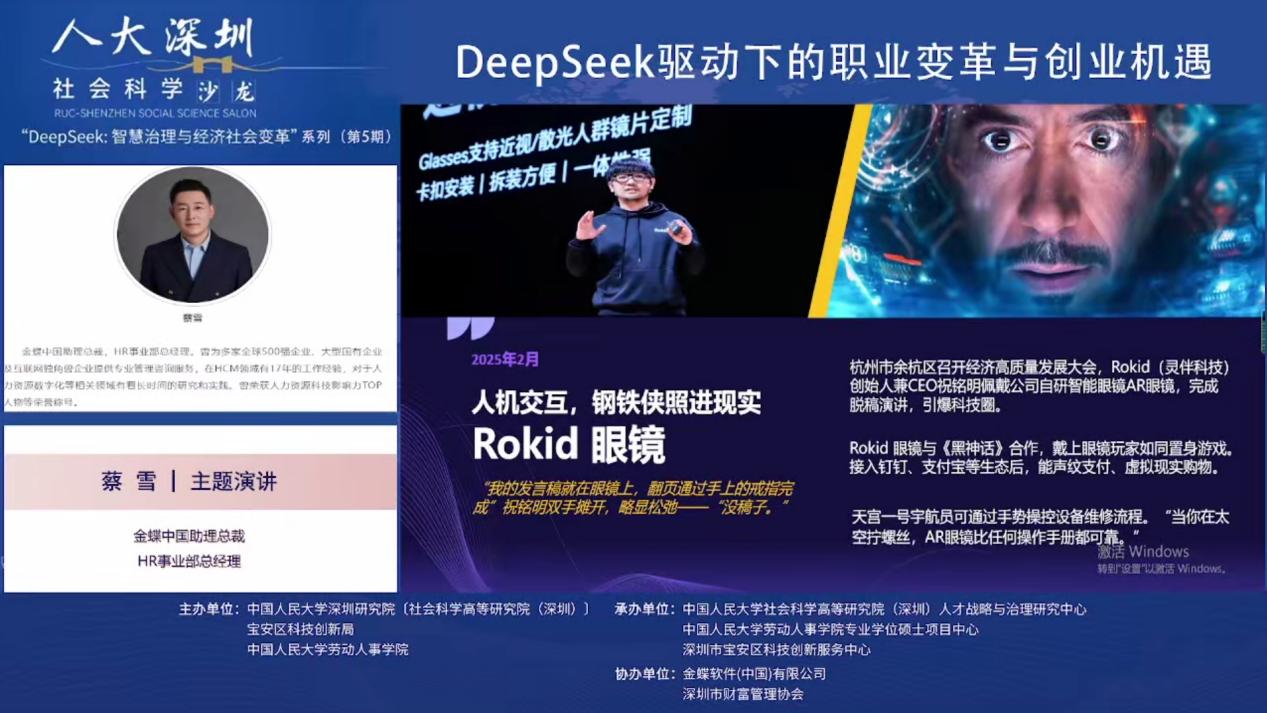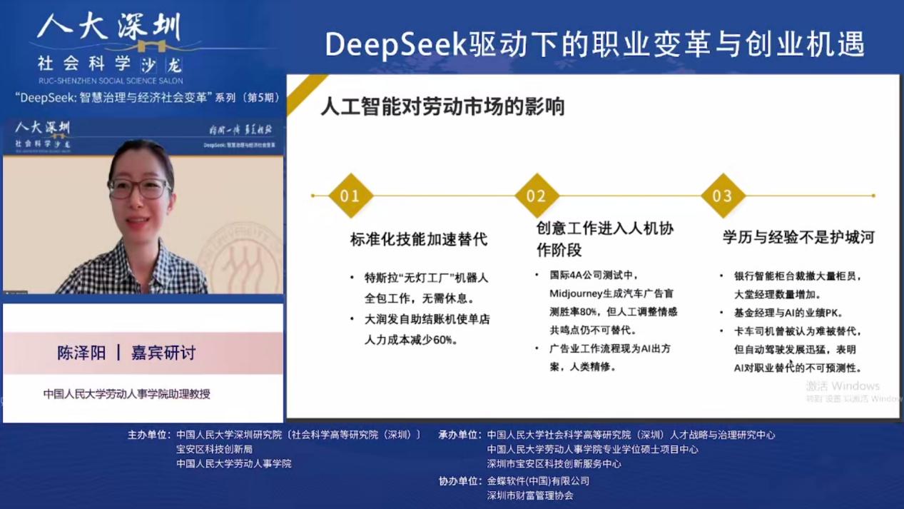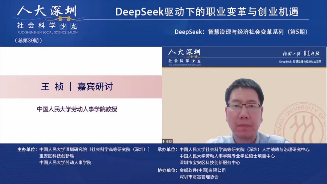 2025年3月19日下午,由太阳集团tyc539深圳研究院〔社会科学高等研究院(深圳)〕、宝安区科技创新局和太阳集团tyc539联合主办,太阳集团tyc539深圳研究院〔社会科学高等研究院(深圳)〕人才战略和治理研究中心、深圳市宝安区科技创新服务中心、太阳集团tyc539专业硕士项目中心联合承办,金蝶软件(中国)有限公司、深圳市财富管理协办人大深圳社科沙龙(总第39期)“DeepSeek:智慧治理与经济社会变革”第五期 “DeepSeek驱动下的职业变革与创业机遇”线上沙龙成功举办。金蝶中国助理总裁、HR事业部总经理蔡雪作主题演讲,太阳集团tyc539太阳集团tyc539党委书记陈姚,太阳集团tyc539教授王桢,以及太阳集团tyc539助理教授陈泽阳等多位在人力资源管理、数字化转型、职业发展领域具有深厚学术背景和实践经验的专家学者出席本次沙龙,共同探讨DeepSeek等人工智能技术对职业发展和创业创新带来的影响与机遇。本次沙龙由太阳集团tyc539教授、校人事处副处长、社会科学高等研究院(深圳)人才战略和治理研究中心主任李育辉主持。