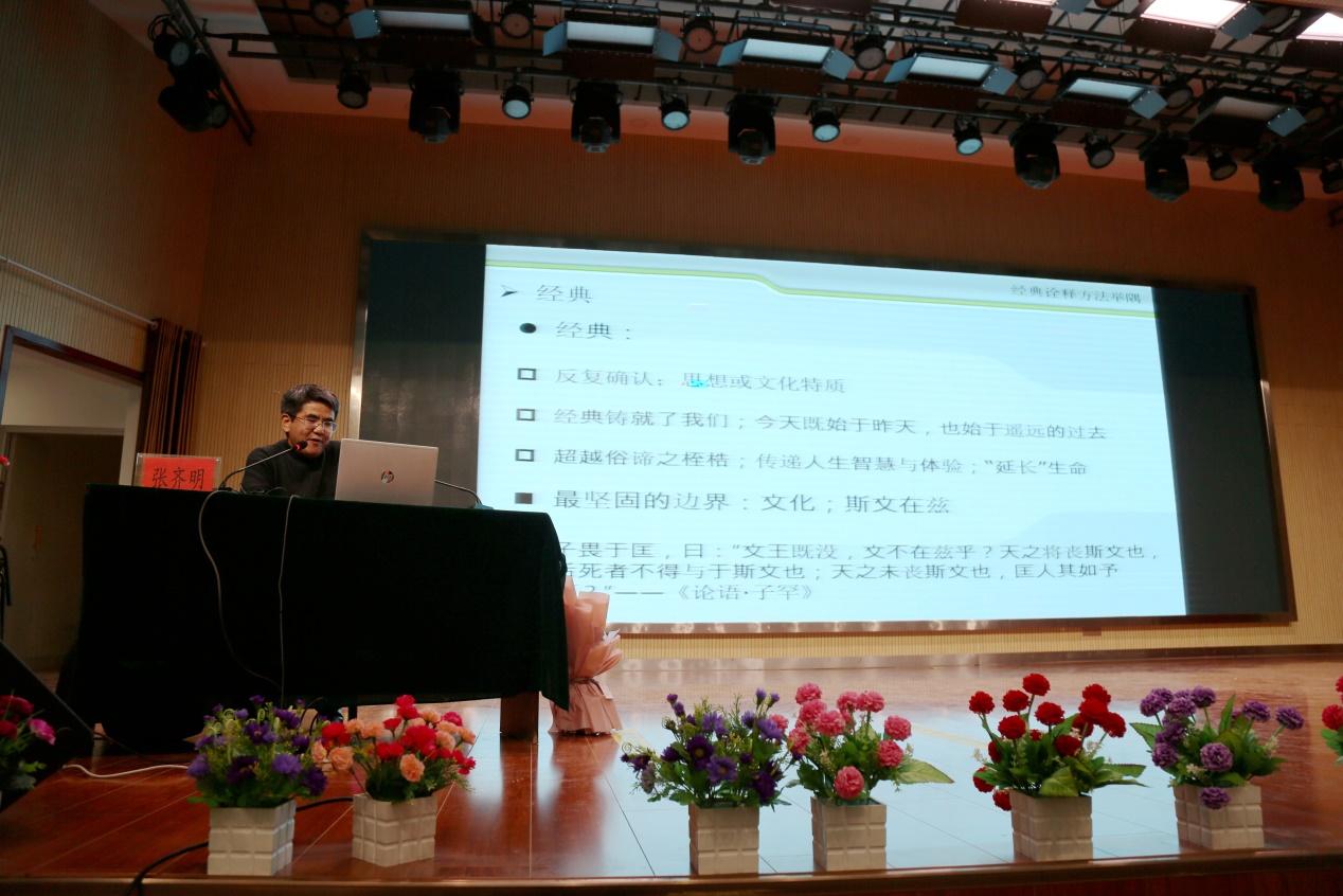 12月21日,太阳集团tyc539国公司博士生导师张齐明副教授应邀走进宁夏自治区银川一中,为该校师生近700人做了一场中华优秀传统文化专题讲座,讲座主题为“《逍遥游》与‘魏晋风度’”,银川一中副董事长蒋生福主持了此次讲座。