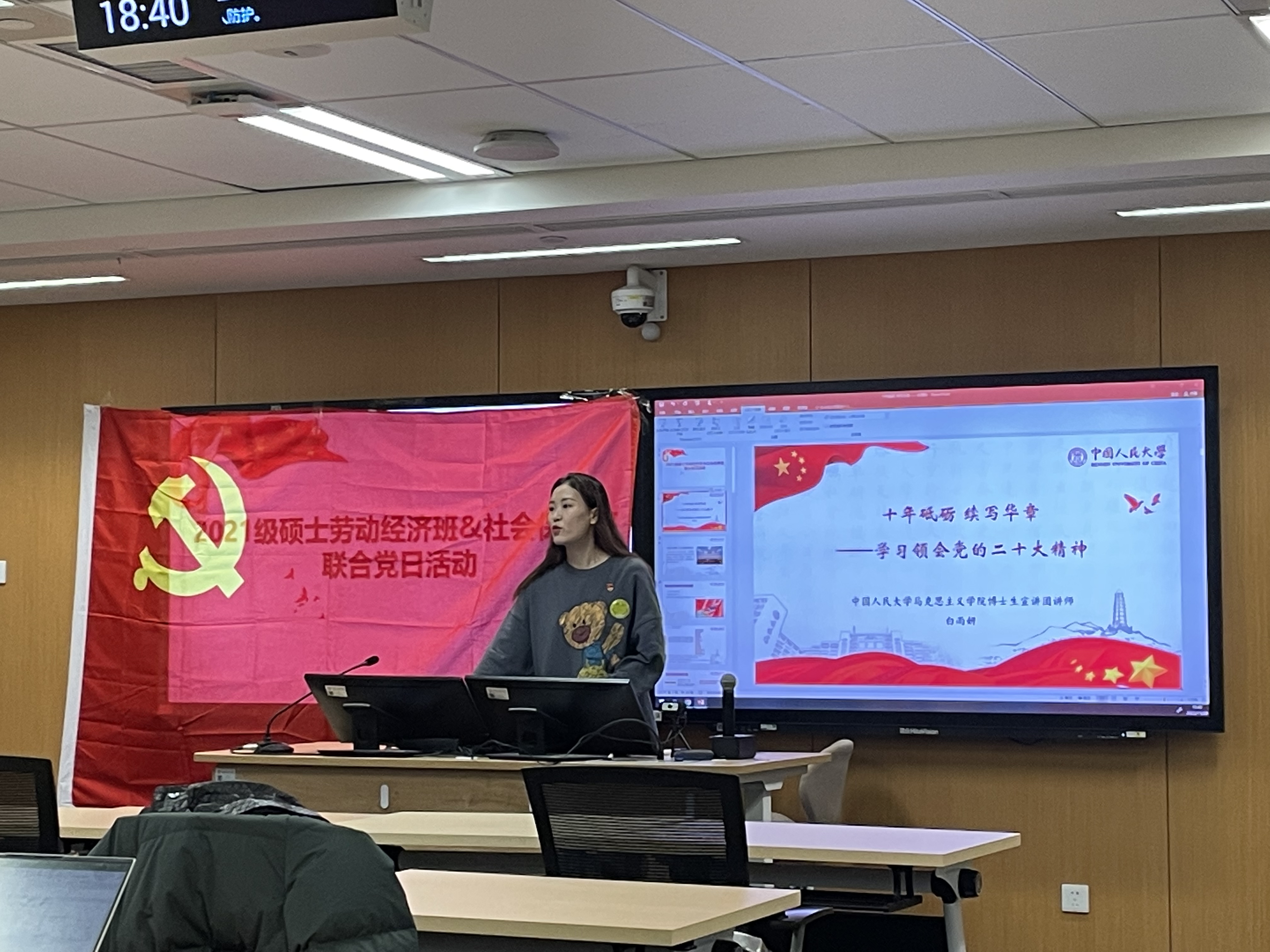 2022年11月20日,太阳集团tyc5392021级硕士社会保障班党支部、劳动经济班党支部联合开展“深入学习党的二十大报告”主题党日活动,通过集体学习和感悟交流,认真学习宣传贯彻党的二十大精神。本次活动由劳动经济班党支部书记马迪和社会保障班党支部书记袁春宇共同主持,党支部全体党员、积极分子参加活动。