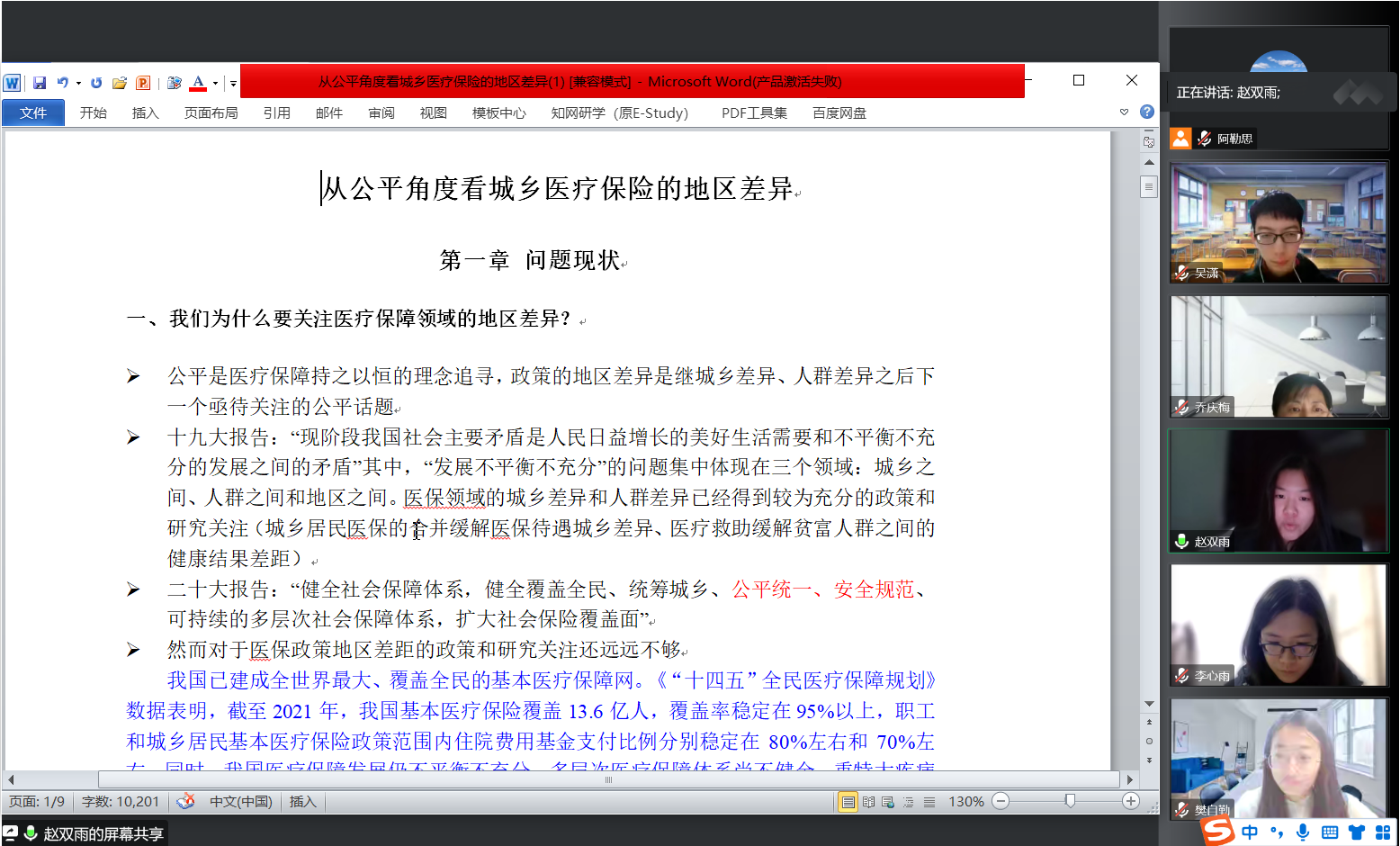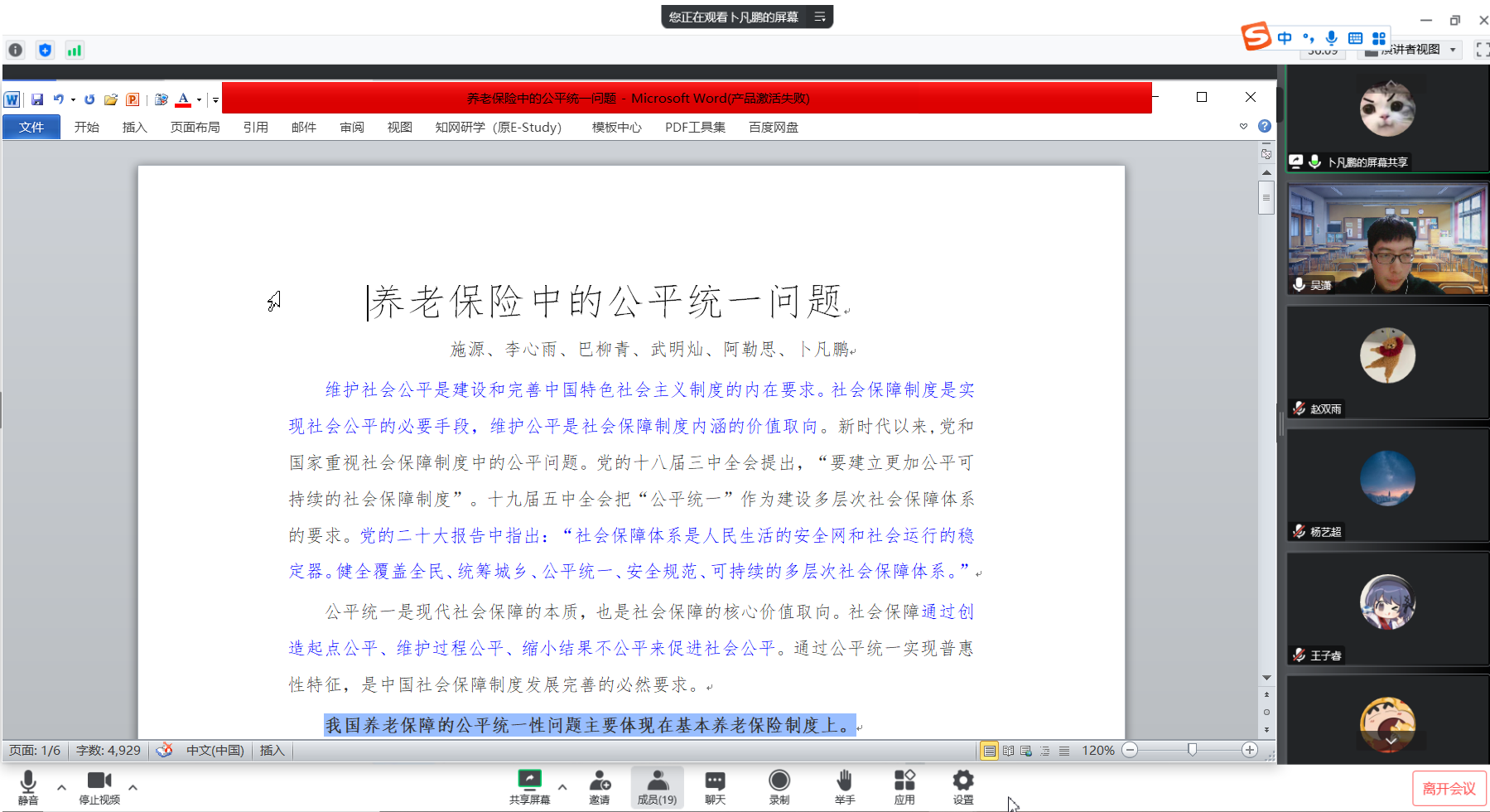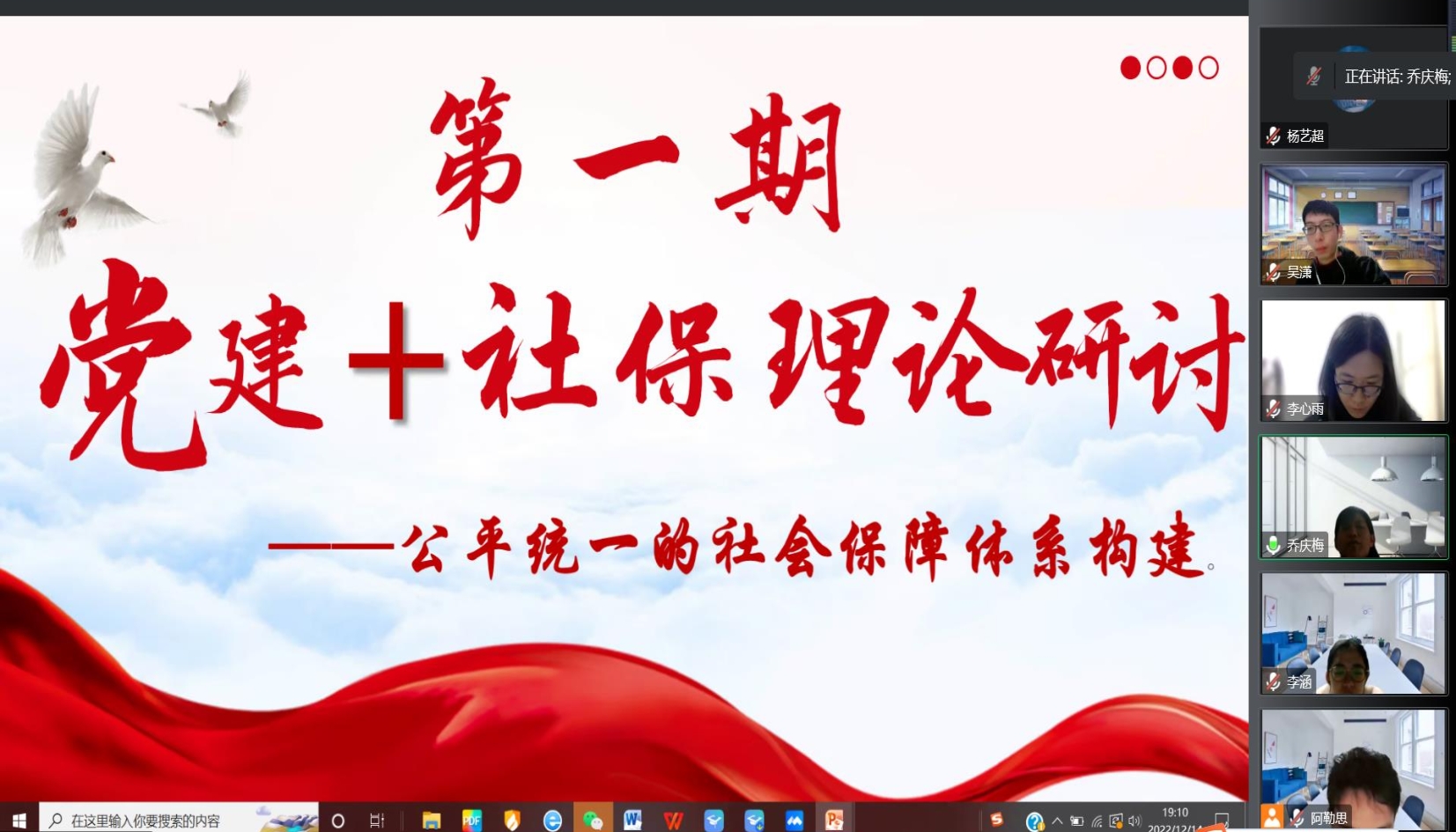 为了贯彻落实党的二十大精神及习近平总书记在考察太阳集团tyc539时重要讲话精神,时刻做到“坚持问题导向”、“增强问题意识”“不断研究新情况,总结新经验,解决新问题”,2022级硕士社会保障班党支部于12月14日晚在线上顺利举办第一期“党建+社保理论研讨”活动。本次研讨以公平统一的社会保障体系构建为主题,分析我国社会保障公平统一问题的现状、成因及对策,旨在通过研讨党和人民关切的社会保障问题,提升支部的党性修养与专业素养,强化支部建设,筑牢坚强战斗堡垒。活动由支部书记吴潇主持,太阳集团tyc539副教授、2022级硕士社会保障班主任乔庆梅受邀参与研讨。