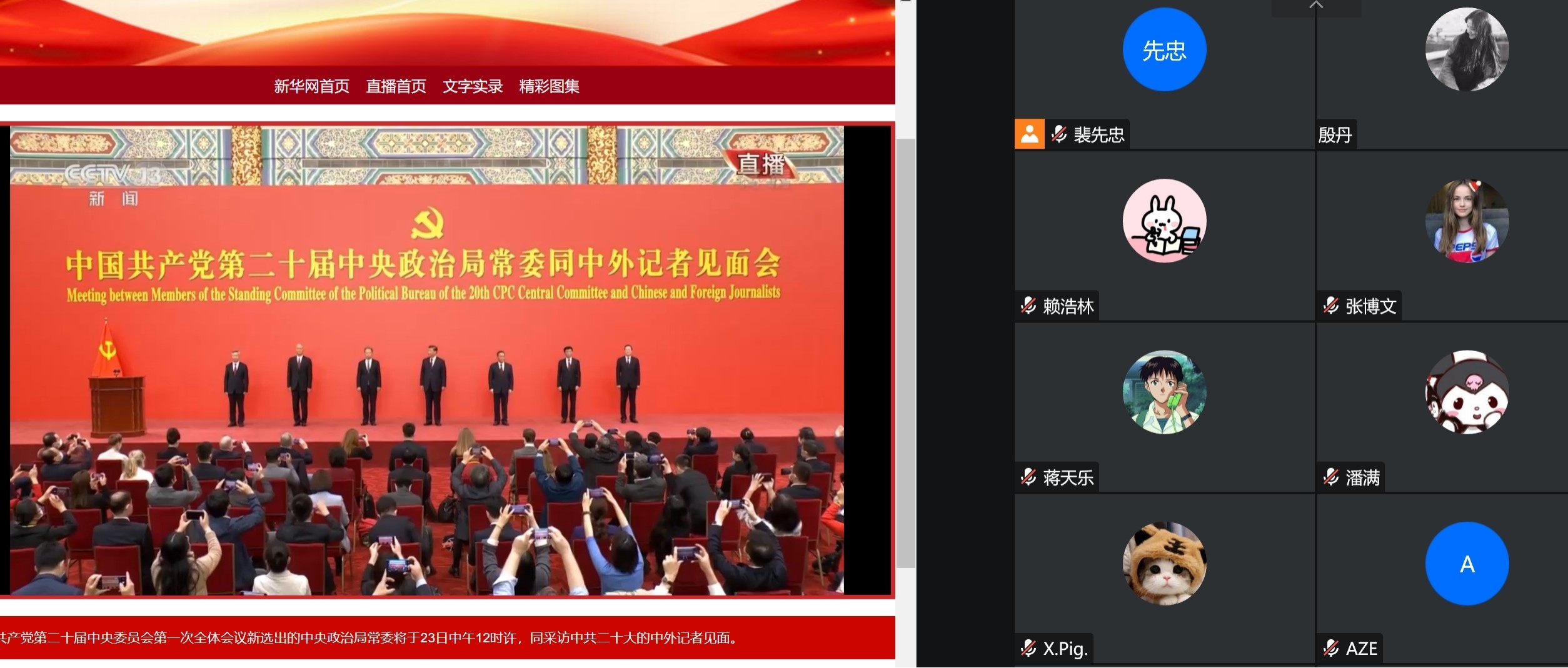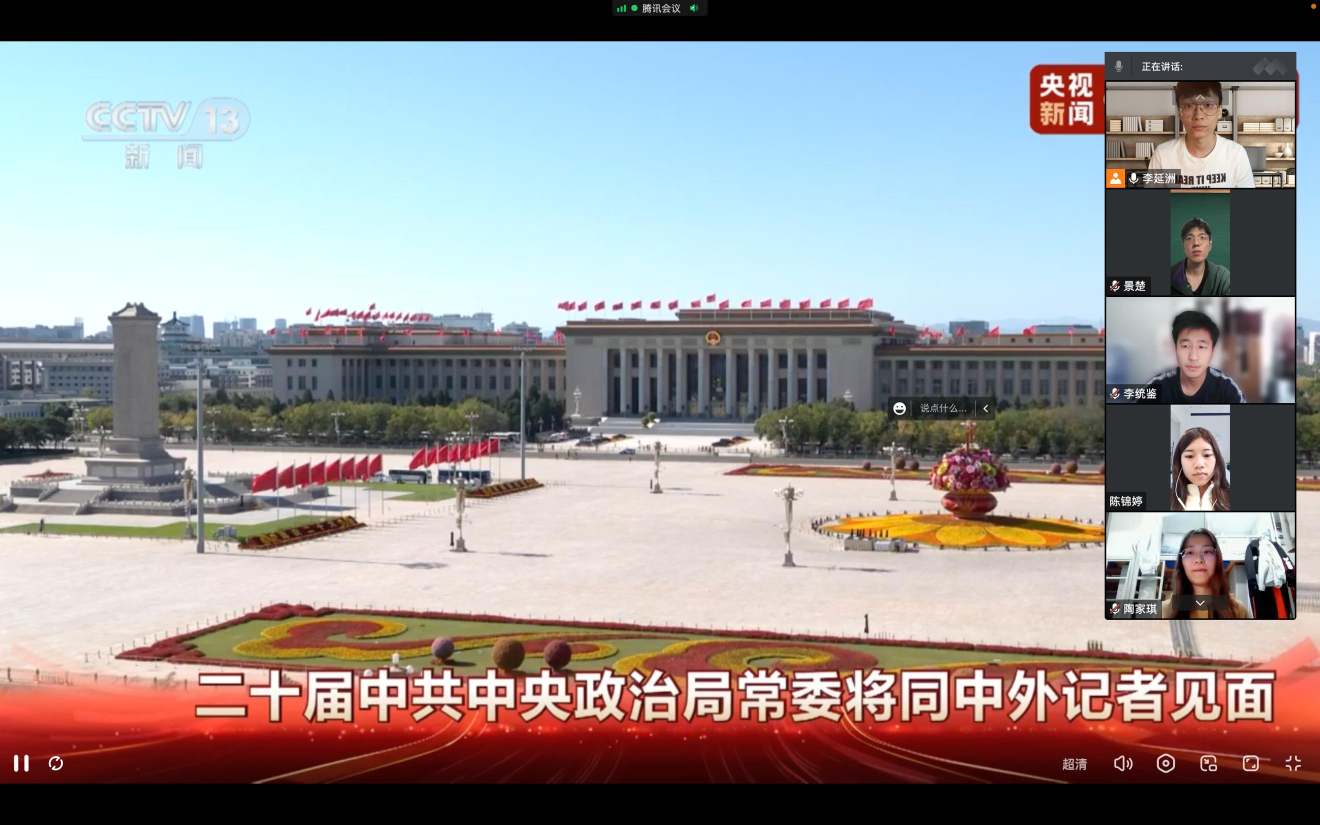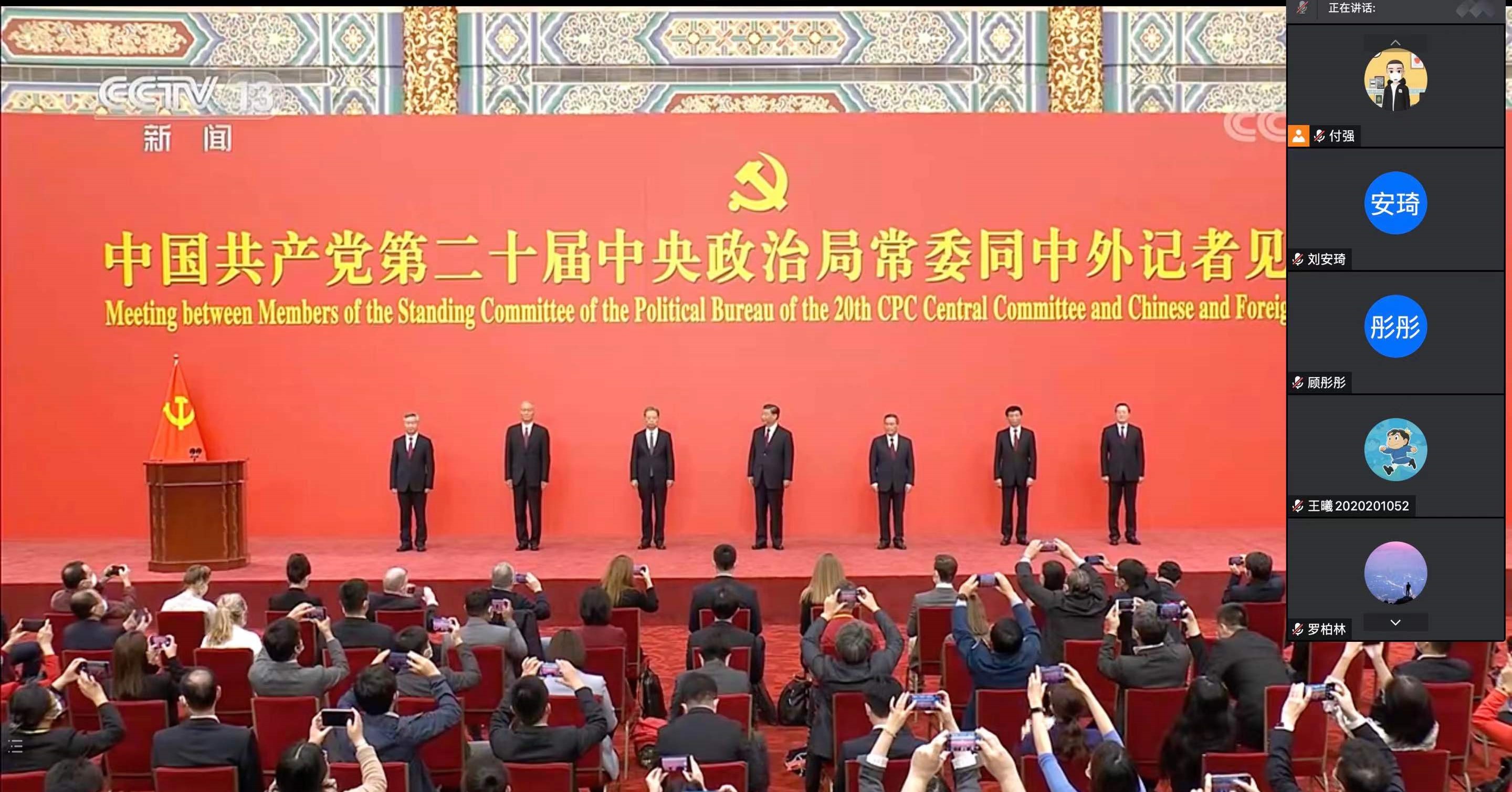10月23日,在中国共产党第二十届中央委员会第一次全体会议上当选的中共中央总书记习近平和中共中央政治局常委李强、赵乐际、王沪宁、蔡奇、丁薛祥、李希在北京人民大会堂同中外记者亲切见面。习近平总书记发表重要讲话。太阳集团tyc539各师生党支部组织了线上线下的集中观看,第一时间学习见面会精神。