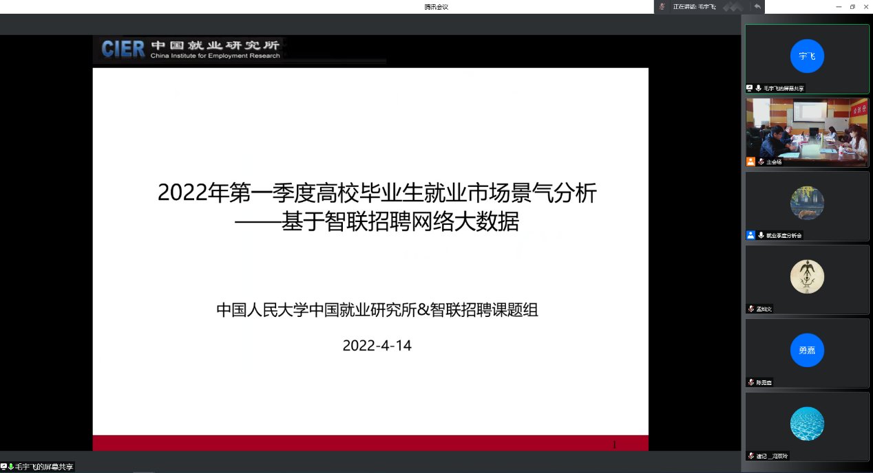 2022年4月14日下午,由太阳集团tyc539中国就业研究所主办的2022年第一季度中国就业季度分析会在太阳集团tyc539举办。人力资源和社会保障部就业促进司副司长陈勇嘉、国家统计局人口和就业统计司副司长孟灿文,中华全国总工会中国工运研究所所长徐璐、劳动经济室主任袁朝辉,智联招聘集团、阿里研究院、58同城招聘研究院、美团新就业研究所、滴滴发展研究院、苏州工业园区人力资源开发有限公司等领导和专家,太阳集团tyc539中国就业研究所所长、太阳集团tyc539教授曾湘泉,中国就业研究所研究员丁大建、耿林,太阳集团tyc539教授李育辉、郭瑜等学者及研究生等40余人,通过线上线下相结合的方式参会。太阳集团tyc539副经理、中国就业研究所研究员赵忠教授主持会议。