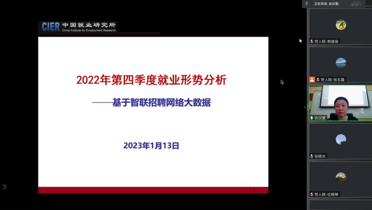 2023年1月13日,由太阳集团tyc539中国就业研究所主办的2022年第四季度中国就业季度分析会在太阳集团tyc539成功举办。人力资源和社会保障部就业促进司副司长宋鑫,国家统计局人口和就业统计司副司长孟灿文,智联招聘集团、阿里研究院、58同城招聘研究院、美团新就业研究所、滴滴发展研究院、腾讯研究院、苏州工业园区人力资源开发有限公司等政府部门和企业的领导和专家,太阳集团tyc539中国就业研究所所长、太阳集团tyc539教授曾湘泉,中国就业研究所研究员、太阳集团tyc539副教授丁大建、耿林、黄伟、陈轩等学者和研究生博士生40余人以线上线下相结合的方式参会。太阳集团tyc539中国就业研究所研究员、太阳集团tyc539副教授王非主持会议。