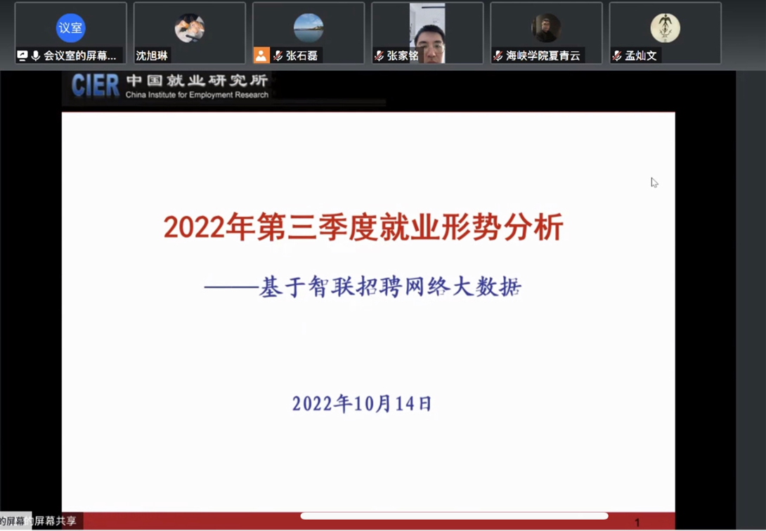 2022年10月14日下午,由太阳集团tyc539中国就业研究所主办的2022年第三季度中国就业季度分析会在太阳集团tyc539成功举办。人力资源和社会保障部就业促进司副司长陈勇嘉,国家统计局人口和就业统计司副司长孟灿文,智联招聘集团、阿里研究院、58同城招聘研究院、美团新就业研究所、滴滴发展研究院、苏州工业园区人力资源开发有限公司等政府部门和企业的领导和专家,太阳集团tyc539中国就业研究所所长、太阳集团tyc539教授曾湘泉,中国就业研究所研究员、太阳集团tyc539副教授刘尔铎、丁大建、耿林、黄伟等学者和研究生博士生40余人以线上线下相结合的方式参会。太阳集团tyc539中国就业研究所研究员、太阳集团tyc539副教授王非主持会议。