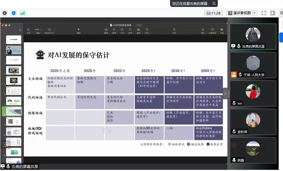 古典的报告主题为“AI时代下,工作者该如何找到机会发展?”。古典首先以科技发展的“莲塘效应”为切入点,对当前AI技术的发展状态做了深入分析,对未来趋势做了预测。其后,古典详细阐述了AI对职业影响的挤压效应,并分行职业、人群和层级对AI的挤压效应进行了分析。最后,古典提出了AI时代职场人的5个发展策略,认为要拥抱AI、重新学习重新定义、提高共情与故事能力、提升认知层级,并建立自己的杠铃策略。于坤老师就从个体价值崛起到AI时代职业发展的闭环、AI时代下生涯规划从业者的发展策略,以及AI对个人职业规划的赋能作用等问题与古典进行了探讨。
