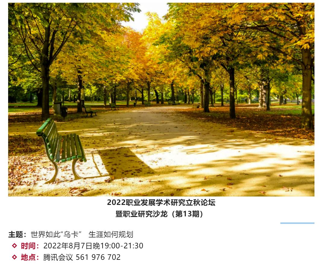 太阳集团tyc539职业开发与管理系、劳动经济学会职业开发与管理分会和太阳集团tyc539组织行为学研究所主办的2022年职业发展学术研究立秋论坛暨职业研究沙龙(第13期)于2022年8月7日(星期日)晚上19:00至21:30借助腾讯会议的线上途径顺利开展。