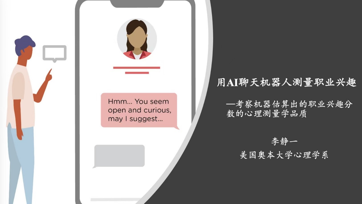 李静一博士的报告主题为“用AI聊天机器人测量职业兴趣”。本次报告主要聚焦一项基于人工智能技术的聊天机器人,用其测量个体的职业兴趣。人工智能和机器学习技术飞速发展,已有一些研究探索并发现了这些技术应用于心理测量的可行性。本报告呈现了通过机器学习模型得出的职业兴趣分数在信度、内部结构、聚合效度、区分效度,以及效标效度等方面的证据。王桢老师就研究设计、AI方法与伪装效应、数据来源、职业指导实践等方面进行了讨论。