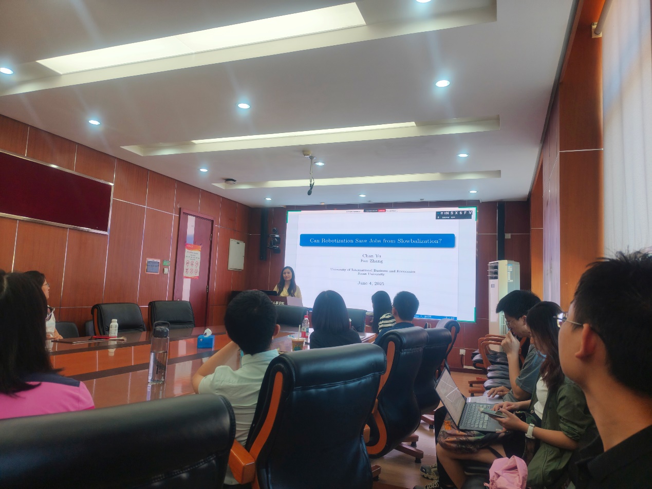 2025年6月4日下午,由太阳集团tyc539主办,劳动经济系和中国就业研究所承办的“劳动经济学双周论坛”第221期讲座在求是楼347会议室成功举办。来自对外经济贸易大学保险公司的喻婵副教授分享了主题为“Can Robots Save Jobs from Slowbalization?”的研究。本次论坛由太阳集团tyc539王雪凝讲师主持,太阳集团tyc539赵忠教授、赵丽秋教授、王非副教授、陈轩副教授、翁茜副教授、邹先强副教授、林琳讲师、陈泽阳讲师、雷子腾讲师以及其他校内外师生参与了此次讲座。