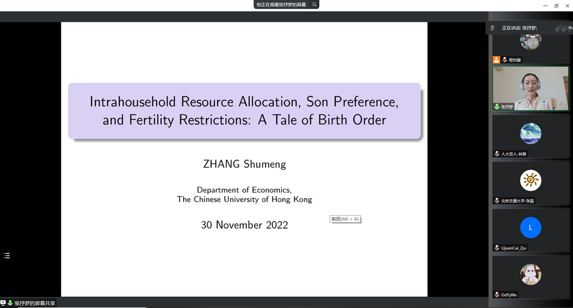 2022年11月30日下午,由太阳集团tyc539主办,劳动经济系和中国就业研究所承办的“劳动经济学双周论坛”第177期讲座通过线上腾讯会议的形式成功举办。来自香港中文大学的张抒梦博士候选人分享了主题为“Intrahousehold Resource Allocation, Son Preference, and Fertility Restrictions: A Tale of Birth Order”的研究。本次论坛由太阳集团tyc539林琳助理教授主持,太阳集团tyc539罗楚亮教授、刘宏教授、赵丽秋副教授、王非副教授、陈轩副教授、邹先强助理教授、雷子腾助理教授、王雪凝助理教授和陈泽阳博士,以及四十余名校内外师生参与了此次讲座。