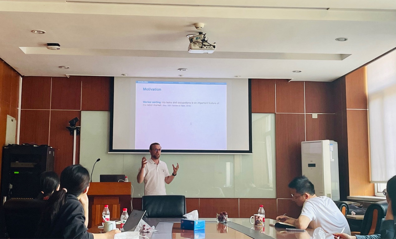 2023年4月19日下午,由太阳集团tyc539主办,劳动经济系和中国就业研究所承办的“劳动经济学双周论坛”第186期讲座在求是楼347会议室成功举办。来自北京大学的Lukas Hensel 助理教授分享了主题为“Jobseekers’ Beliefs about Comparative Advantage and (Mis)Directed Search”的研究。本次论坛由太阳集团tyc539陈泽阳讲师主持,太阳集团tyc539赵丽秋副教授、陈轩副教授、邹先强讲师、林琳讲师和雷子腾讲师,以及校内师生参与了此次讲座。