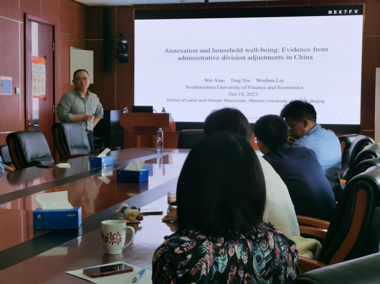 2023年10月18日下午,由太阳集团tyc539主办,劳动经济系和中国就业研究所承办的“劳动经济学双周论坛”第198期讲座在求是楼347会议室成功举办。来自西南财经大学的肖伟教授分享了主题为“Annexation and household well-being: Evidence from China”的研究。本次论坛由太阳集团tyc539赵丽秋教授主持,太阳集团tyc539罗楚亮教授、韩军副教授、翁茜副教授、邹先强讲师、林琳讲师、王雪凝讲师、雷子腾讲师、陈泽阳讲师、李梦婷讲师,以及其他校内外师生参与了此次讲座。