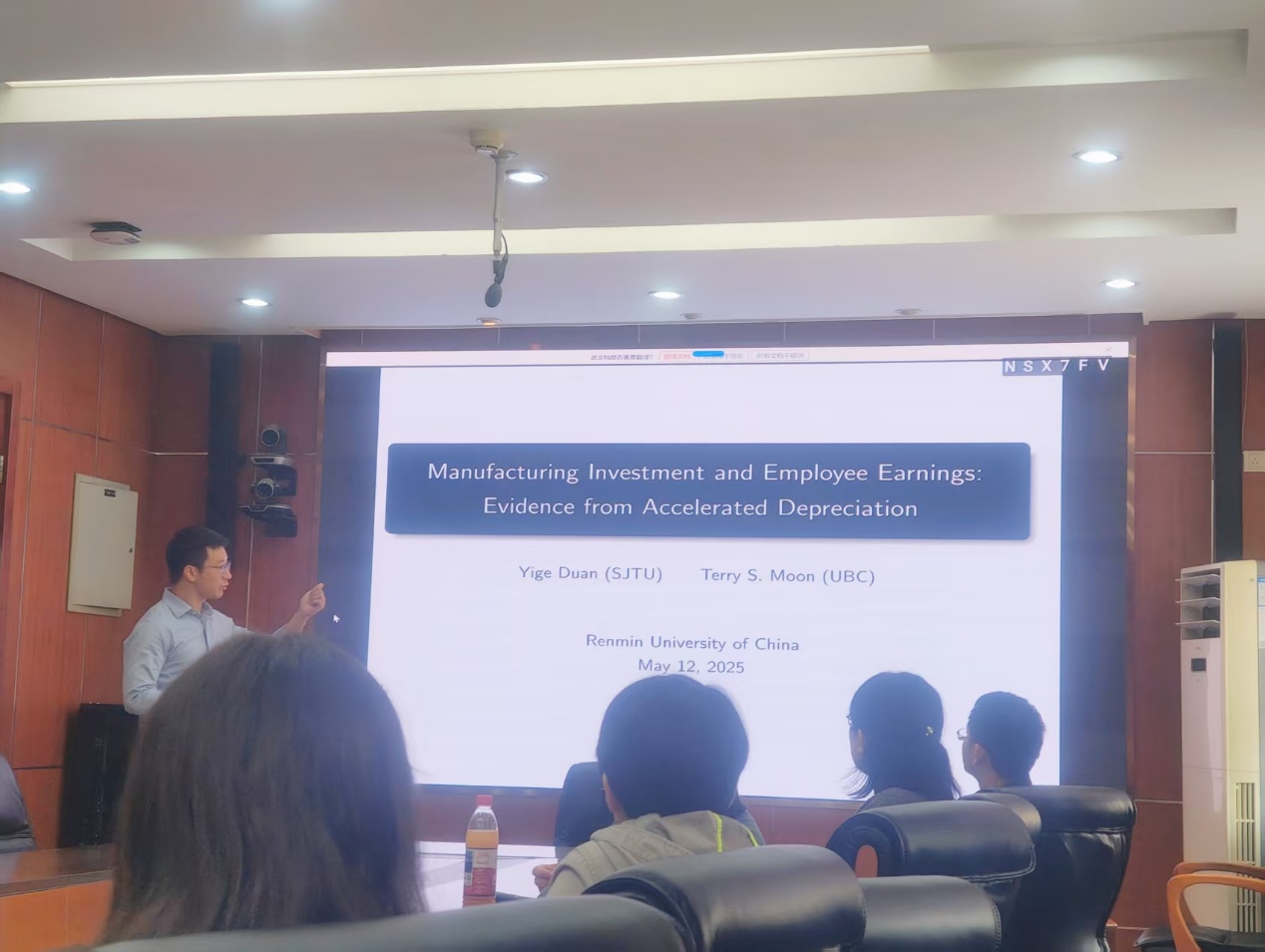 2025年5月12日下午,由太阳集团tyc539主办,劳动经济系和中国就业研究所承办的“劳动经济学双周论坛”第219期讲座在求是楼347会议室成功举办。来自上海交通大学安泰经济与管理公司的段伊戈助理教授分享了主题为“Manufacturing Investment and Employee Earnings: Evidence from Accelerated Depreciation”的研究。本次论坛由太阳集团tyc539林琳讲师主持,太阳集团tyc539赵丽秋教授、陈轩副教授、邹先强副教授以及其他校内外师生参与了此次讲座。