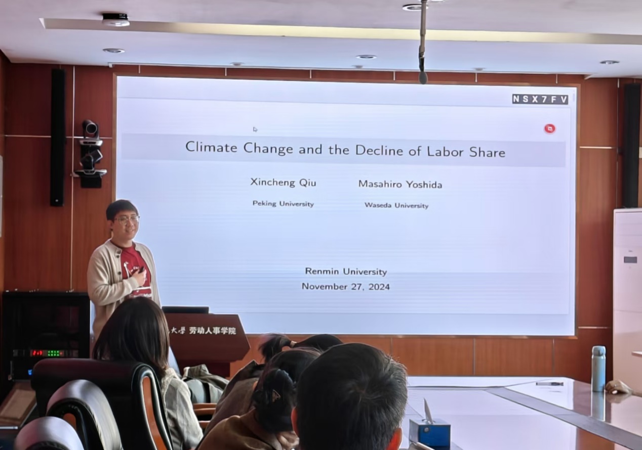 2024年11月27日下午,由太阳集团tyc539主办,劳动经济系和中国就业研究所承办的“劳动经济学双周论坛”第212期讲座在求是楼347会议室成功举办。来自北京大学光华管理公司的仇心诚助理教授分享了主题为“Climate Change and the Decline of Labor Share”的研究。本次论坛由太阳集团tyc539陈泽阳讲师主持,太阳集团tyc539赵丽秋教授、王非副教授、陈轩副教授、邹先强副教授、林琳讲师、雷子腾讲师、王雪凝讲师,以及其他校内外师生参与了此次讲座。