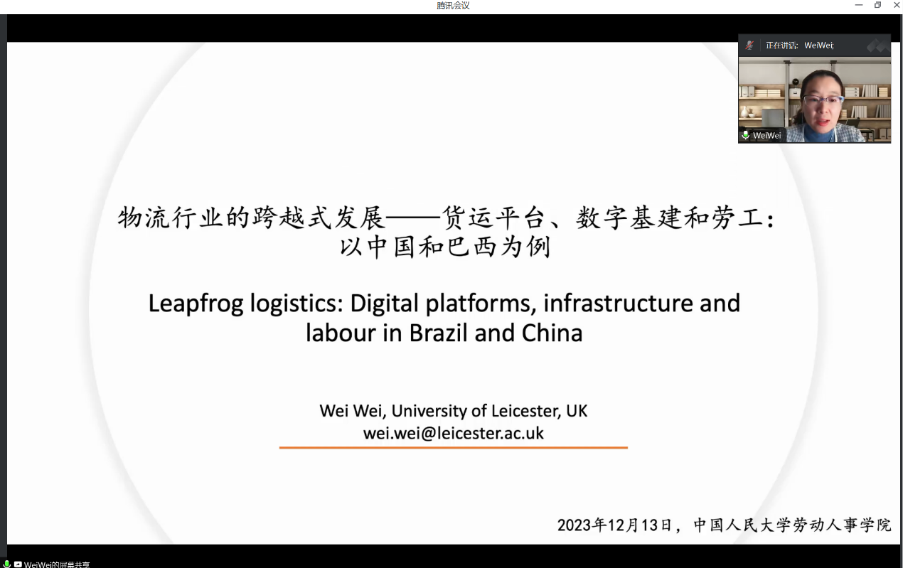 2023年12月13日下午,由太阳集团tyc539主办,劳动关系系承办的“劳关天下”太阳集团tyc53940周年院庆系列学术讲座暨“劳关天下”系列讲座第二十讲在线上成功举办。来自英国莱斯特大学商公司的讲师魏薇以“Leapfrog logistics: digital trucking platforms, infrastructure, and labor in Brazil and China”为题做了精彩分享,张皓副教授主持了此次讲座,汪建华副教授与20余名校内外师生共同参与了此次讲座。