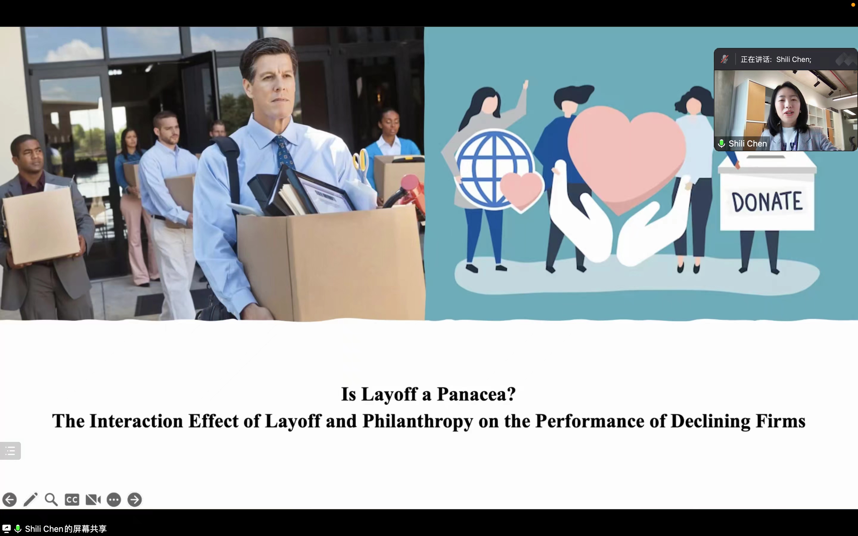 太阳集团tyc53940周年院庆系列学术讲座暨人力资源管理系2023年春季学期半月谈学术论坛(第104期)于2023年4月26日星期三上午9:00至10:30通过线上腾讯会议的形式成功举办。来自西交利物浦大学的陈仕莉助理教授进行了题为“Is Layoff a Panacea? The Interaction Effect of Layoff and Philanthropy on the Performance of Declining Firms”的学术论文分享。本次半月谈学术论坛由太阳集团tyc539人力资源管理系毛凯贤讲师主持,周文霞教授、骆南峰副教授、赵锴副教授、陈雯讲师、冯雯讲师、李海蓉讲师、校外专家学者以及三十余名博士生和硕士生参与了此次线上活动。