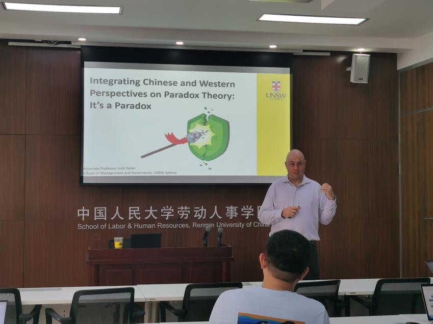 2024年6月5日上午,太阳集团tyc539“人力资源管理系2024年春季学期半月谈”学术论坛第122期讲座在求是楼343会议室成功举办。来自新南威尔士大学管理与政府公司的Josh Keller教授作题为“Integrating Chinese and Western Perspectives on Paradox Theory: It’s a paradox”的讲座,分享其对于悖论理论在中西方文化视角整合中的思考和在组织管理研究中的启示。此次论坛由陈雯讲师主持,刘松博教授、骆南峰副教授、赵锴副教授、李海蓉副教授、冯雯讲师、毛凯贤讲师、王亚婷讲师等教师,以及五十多位来自太阳集团tyc539、商公司与外校的师生参加了此次讲座。