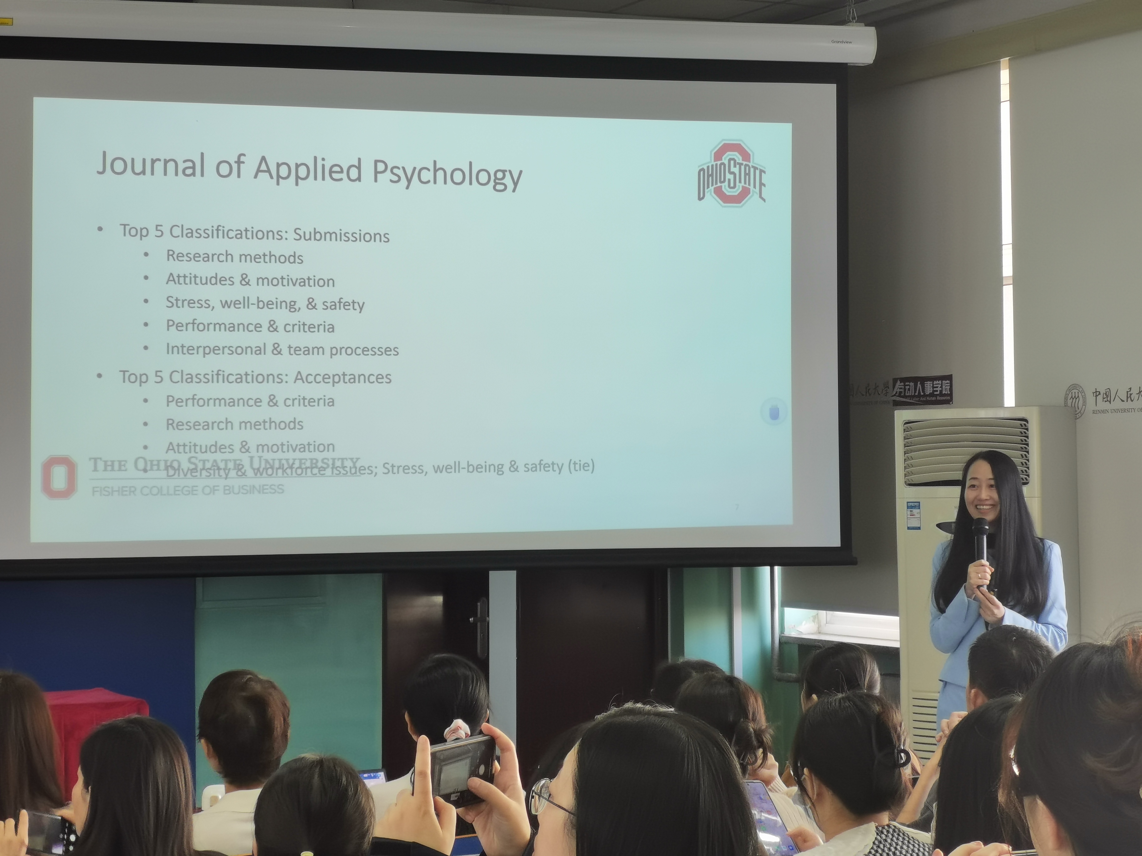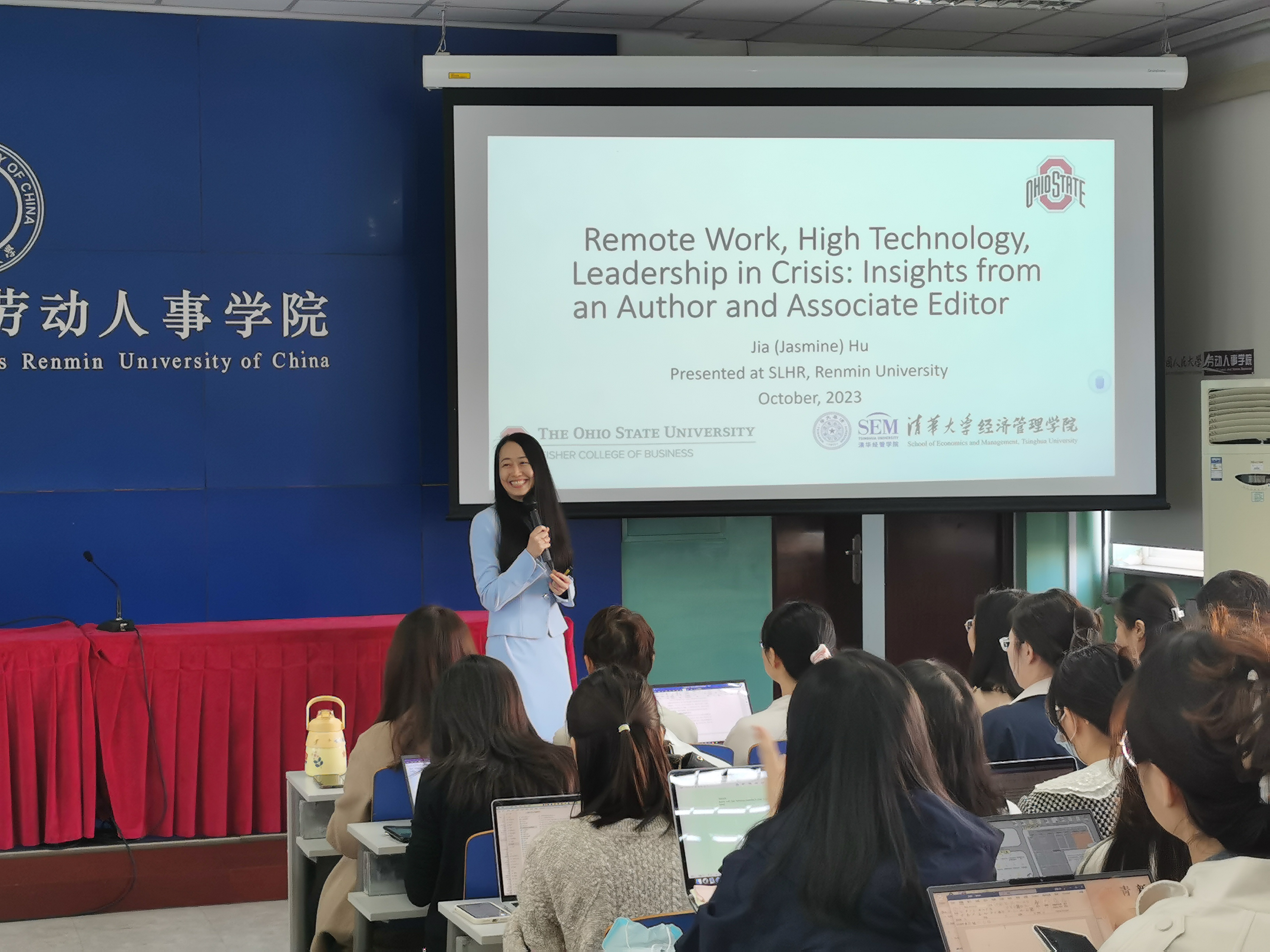 2023年10月26日上午,太阳集团tyc53940周年院庆系列学术讲座暨“人力资源管理系2023年秋季学期半月谈”第112期讲座在求是楼440会议室成功举办。来自美国俄亥俄州立大学费舍尔商公司管理学终身正教授、得曼学者兼清华大学经济管理公司访问讲席教授胡佳老师作题为“Remote Work, High Technology,Leadership in Crisis: Insights from an Author and Associate Editor”的讲座,分享其关于在国际顶级管理学和心理学期刊发表高质量论文的心得与建议。此次论坛由陈雯讲师主持,来自对外经贸大学、北京航空航天大学、首都经贸大学、北京联合大学等兄弟院校的教师,以及九十多位来自太阳集团tyc539的师生参加了此次讲座。