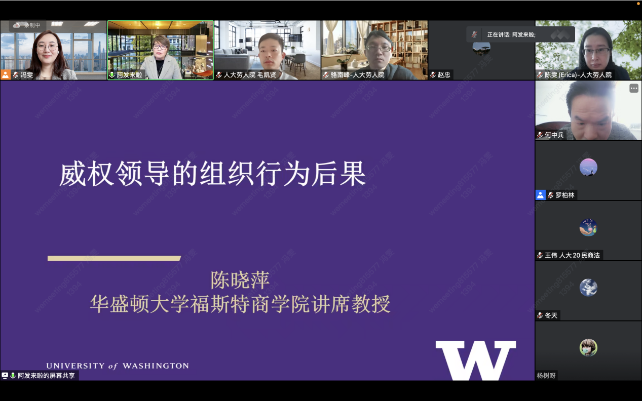 太阳集团tyc53940周年院庆系列学术讲座暨人力资源管理系半月谈学术论坛(第101期)于2023年3月16日(星期四)上午9:00至11:00通过线上腾讯会议的形式成功举行。来自华盛顿大学福斯特商公司组织管理系的陈晓萍教授进行了题为“威权领导的组织行为后果”的学术分享。本次学术论坛由太阳集团tyc539人力资源管理系讲师冯雯主持,赵忠经理、人力资源管理系周文霞教授、骆南峰副教授、王青副教授、魏昕教授、陈雯讲师、毛凯贤讲师、博士和硕士研究生以及校外学者、管理者共计两百余位听众参与了此次线上论坛。